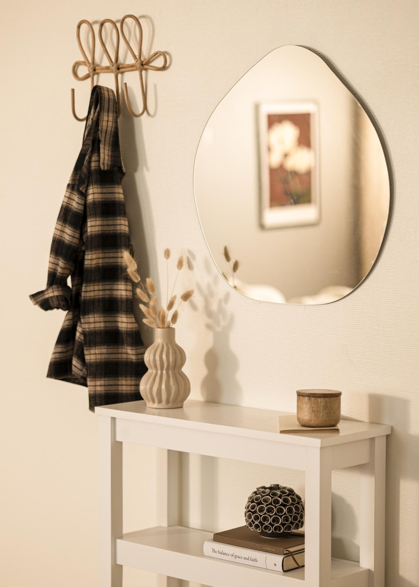 Această oglindă este proiectată pentru a fi versatilă, cu posibilitatea de a fi atârnată atât vertical, cât și orizontal. Acest lucru îți oferă libertatea de a alege cum se potrivește cel mai bine în spațiul tău, fie că este în hol, dormitor sau sufragerie. Forma asimetrică adaugă o notă modernă care completează diferite stiluri de decor și creează un efect vizual interesant.