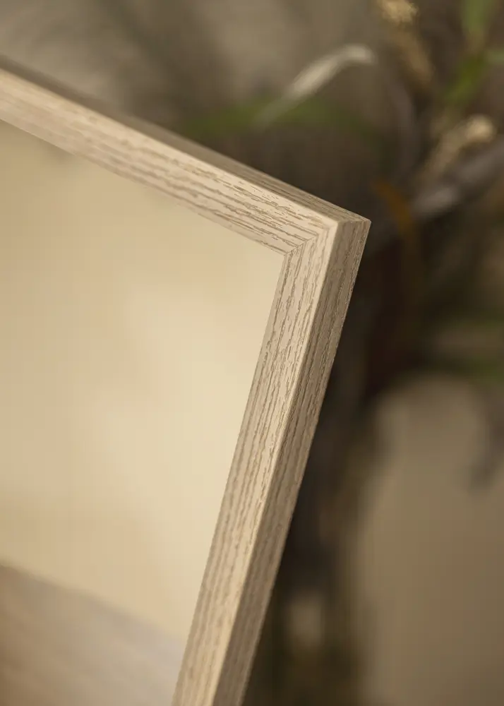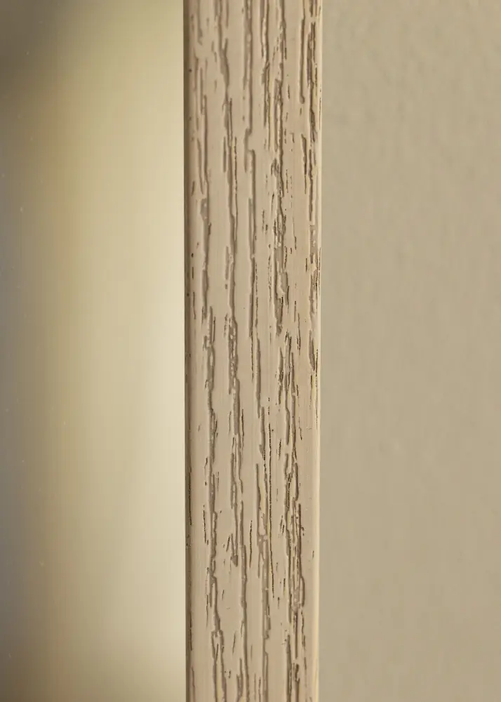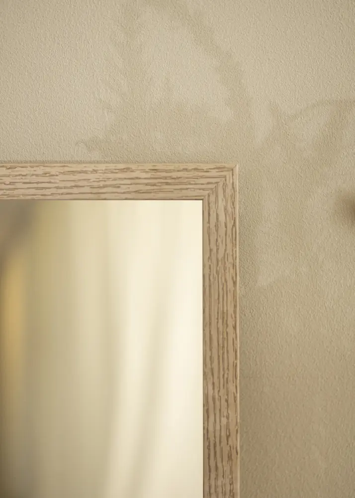Rama oglinzii are o lățime de 20 mm și o adâncime de 20 mm, oferind o încadră discretă dar totuși clară a sticlei de oglindă. Fabricată din lemn de ayous, această oglindă este atât durabilă, cât și ușoară, facilitând agățarea și plasarea. Suprafața mată contribuie la evidențierea detaliilor granulației și creează un aspect moale care completează designul general al oglinzii.