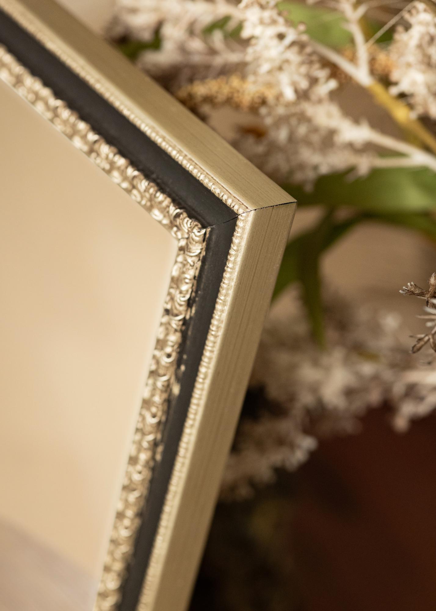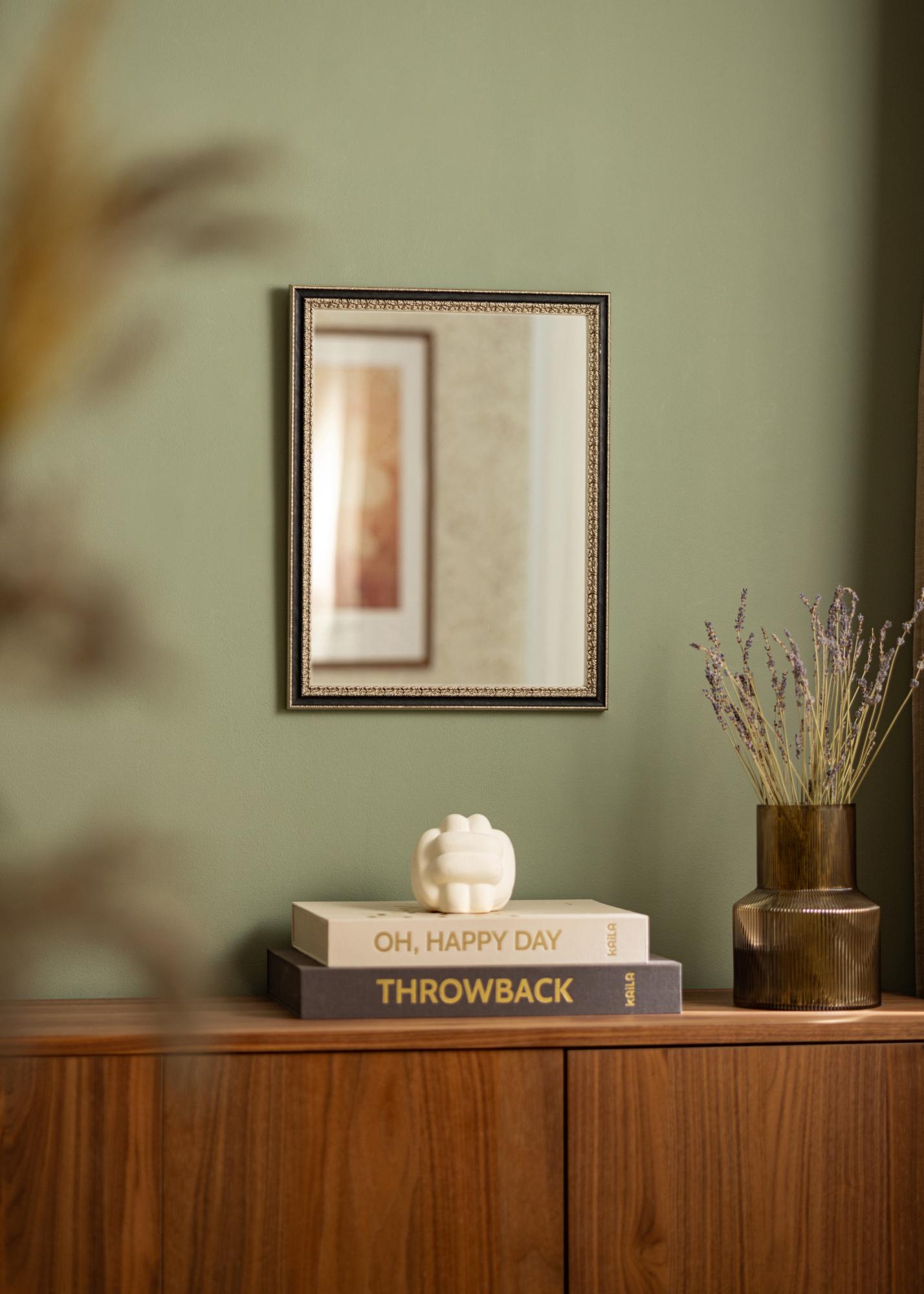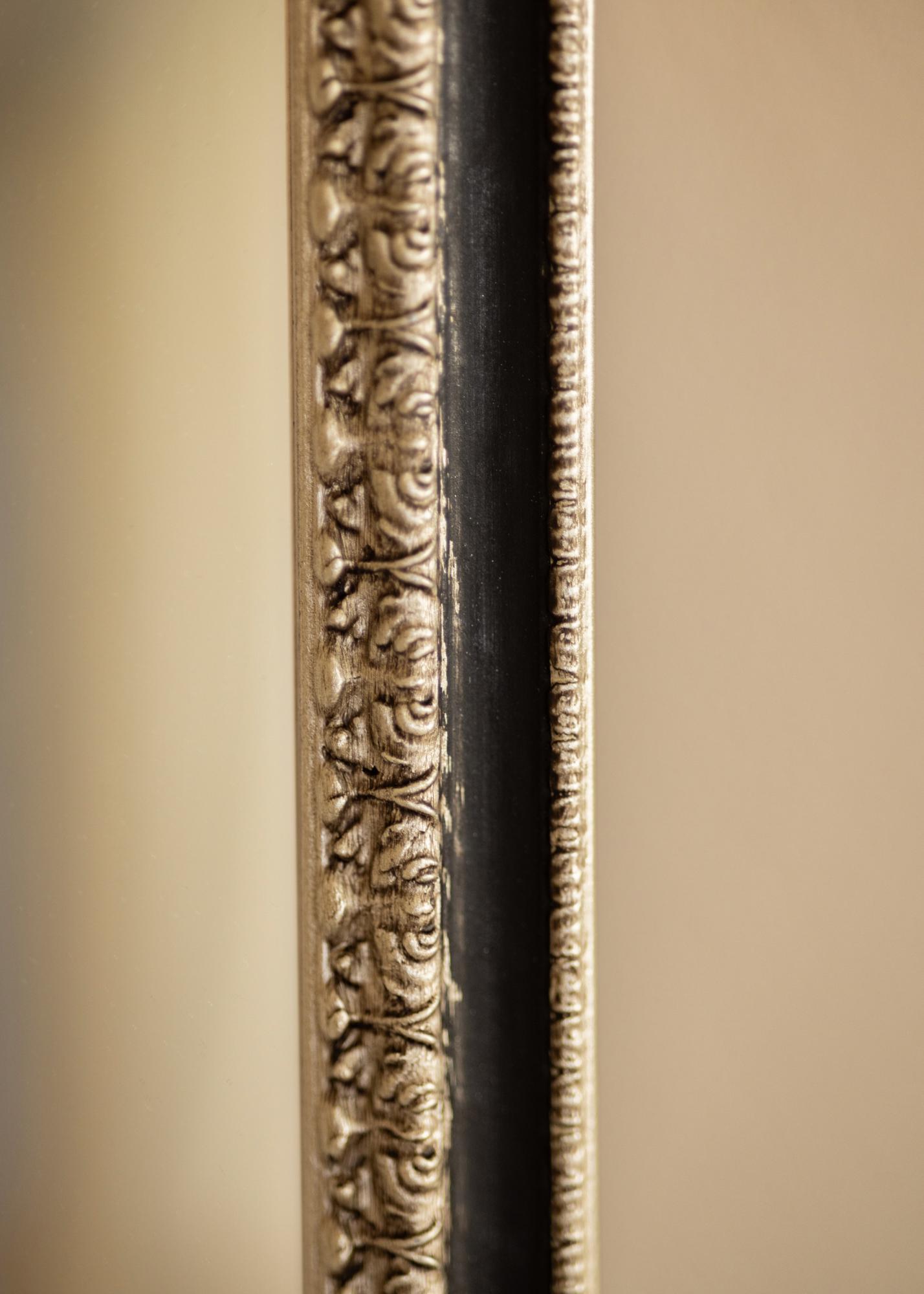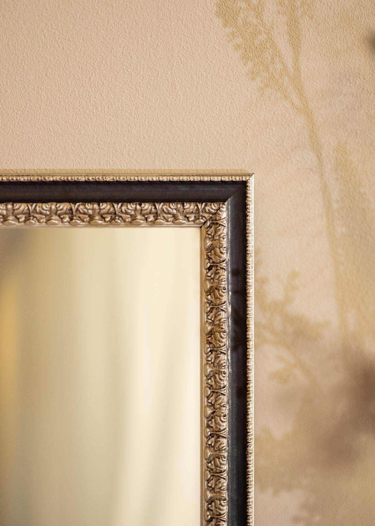 Rama este realizată din lemn și are un finisaj de aur antic cu ornamente decorative care oferă oglinzii o senzație clasică și atemporală. Detaliile ornamentate sunt puse în valoare de marginea neagră, creând un echilibru armonios între antic și modern.
