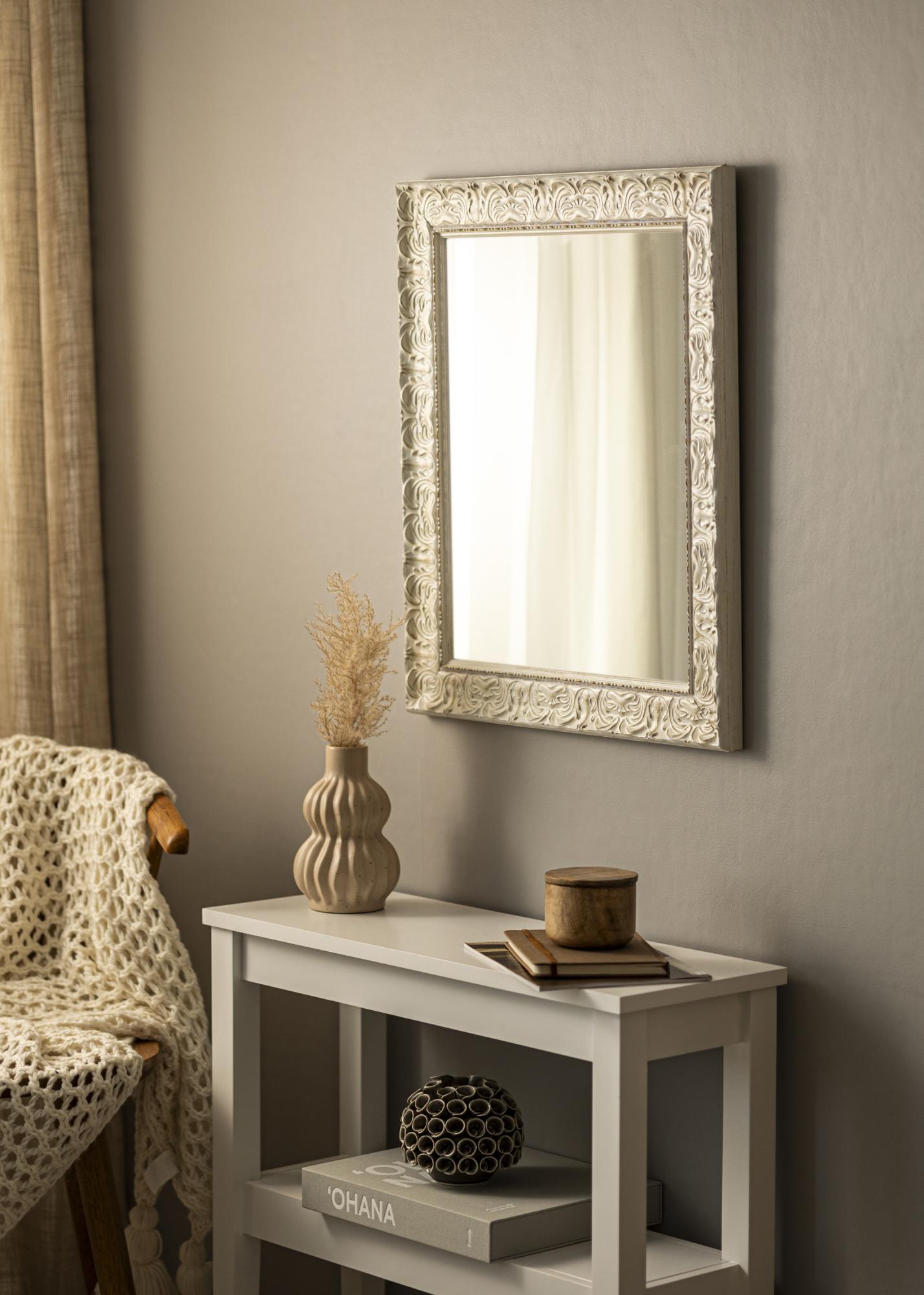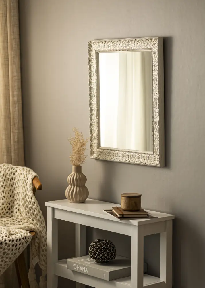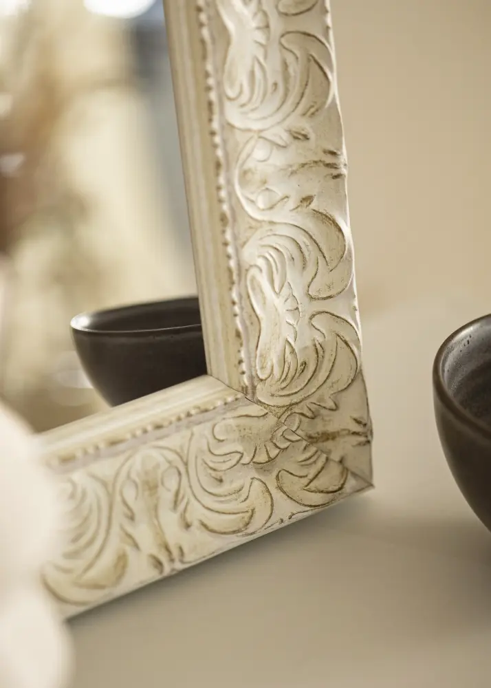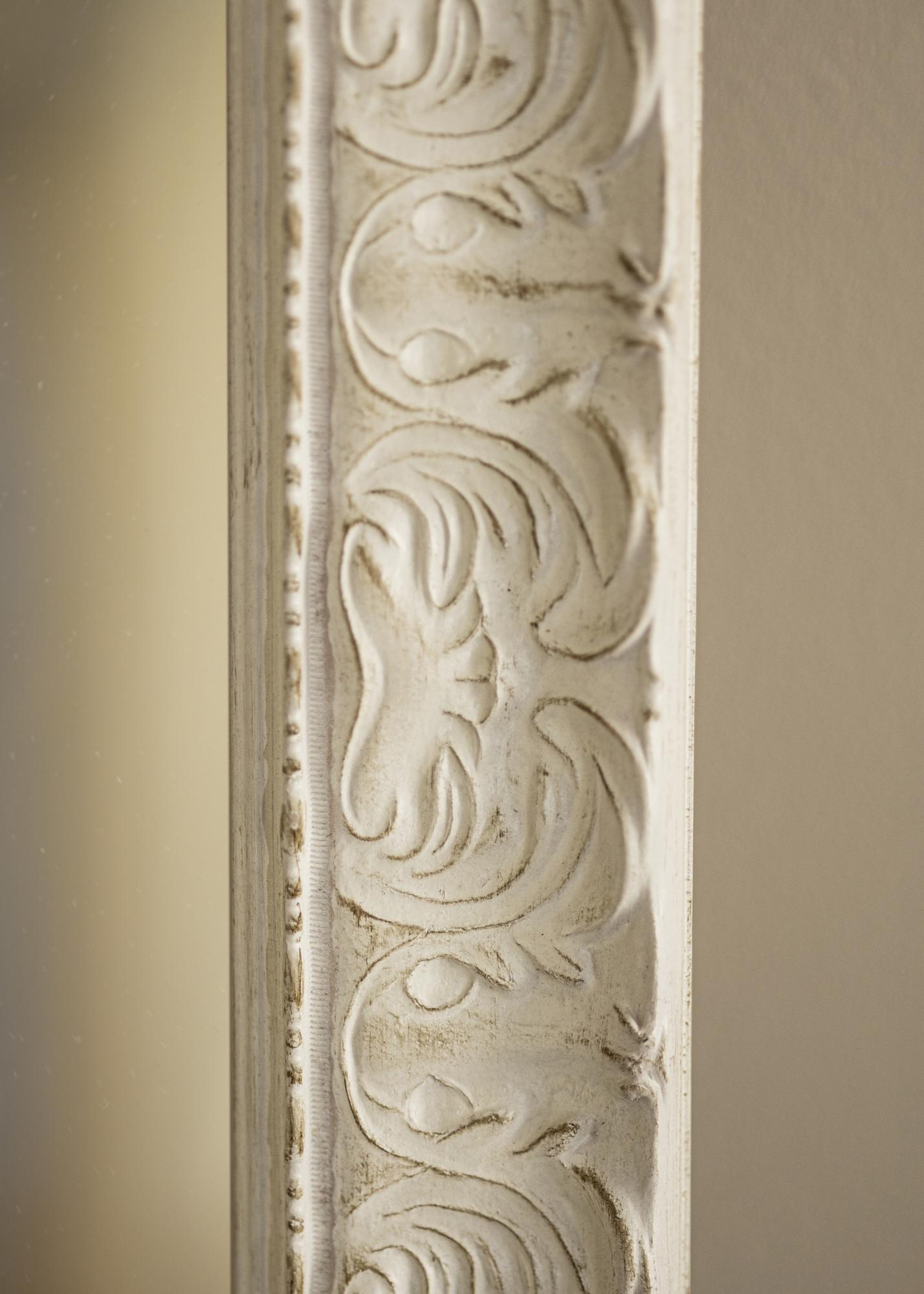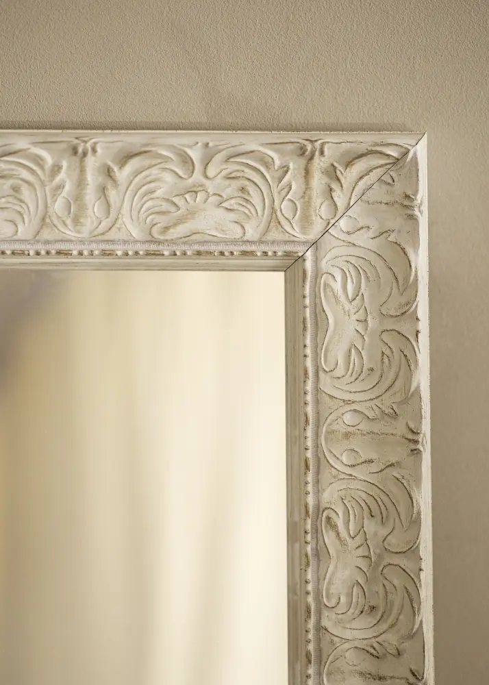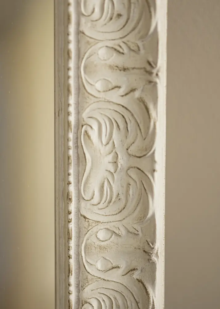 Finish-ul antichizat alb al oglinzii cu relief decorativ și suprafața subtil uzată îi conferă un caracter unic. Detaliile împodobite îi accentuează expresia clasică și o transformă într-un punct de atracție în cameră. Indiferent dacă ai un decor modern sau tradițional, această oglindă se va integra și va adăuga ceva în plus.
