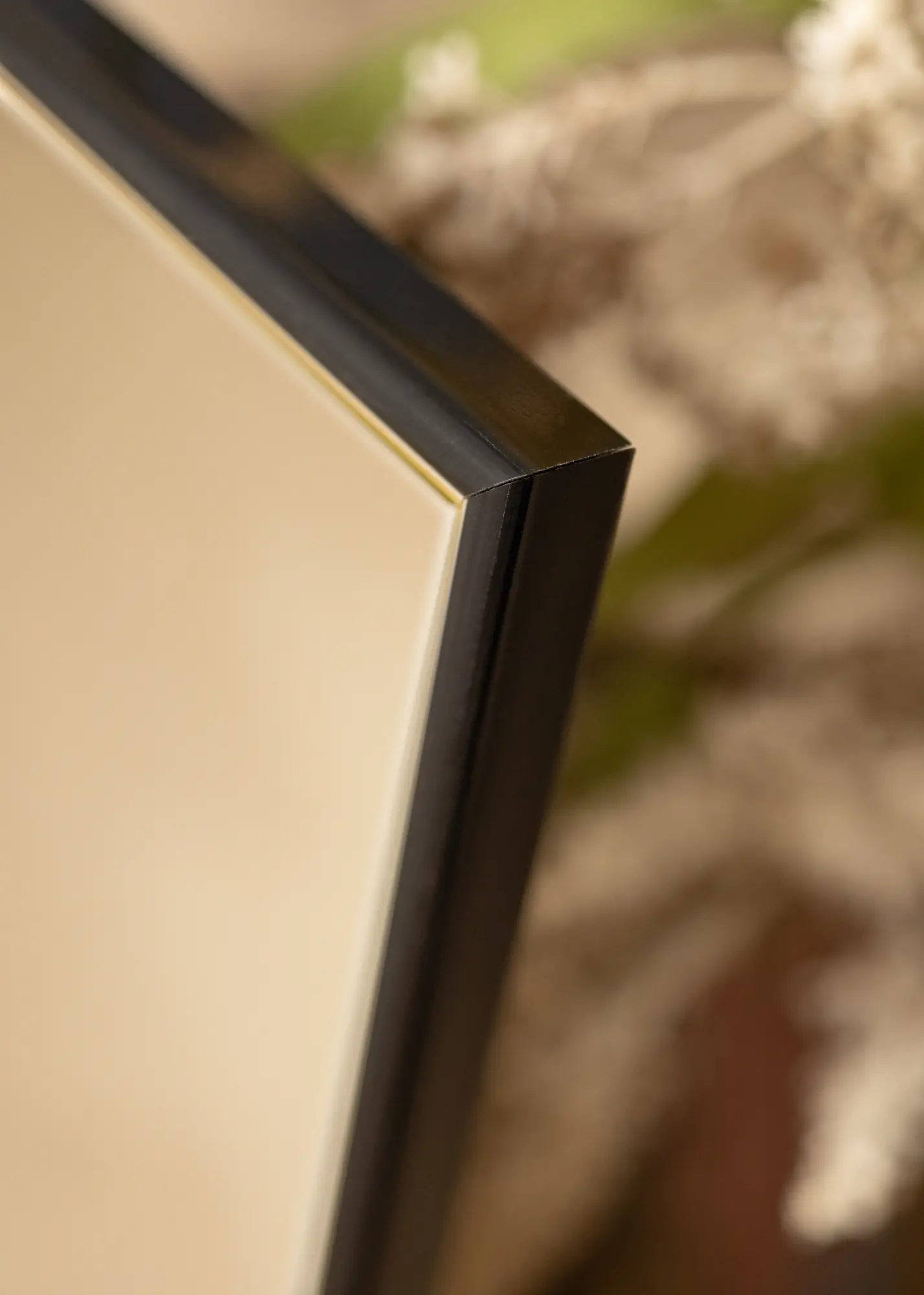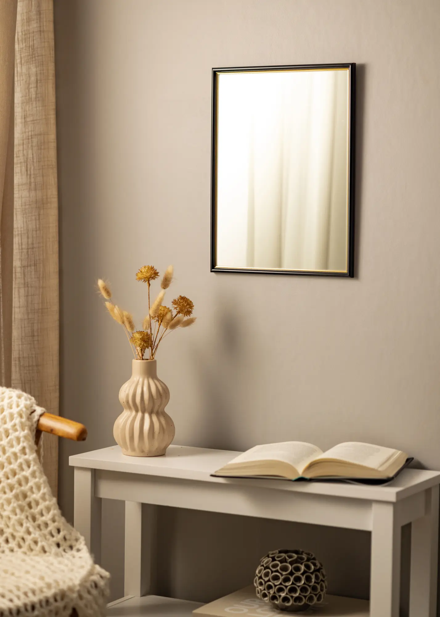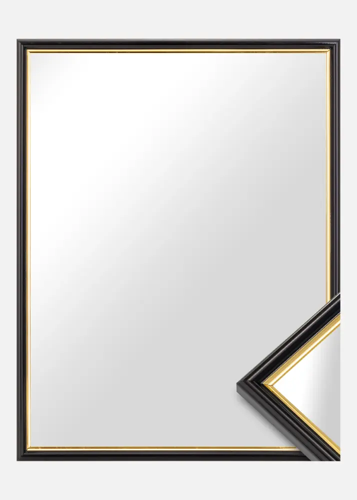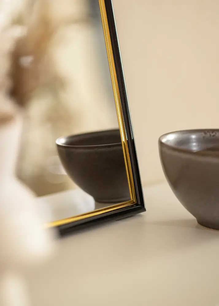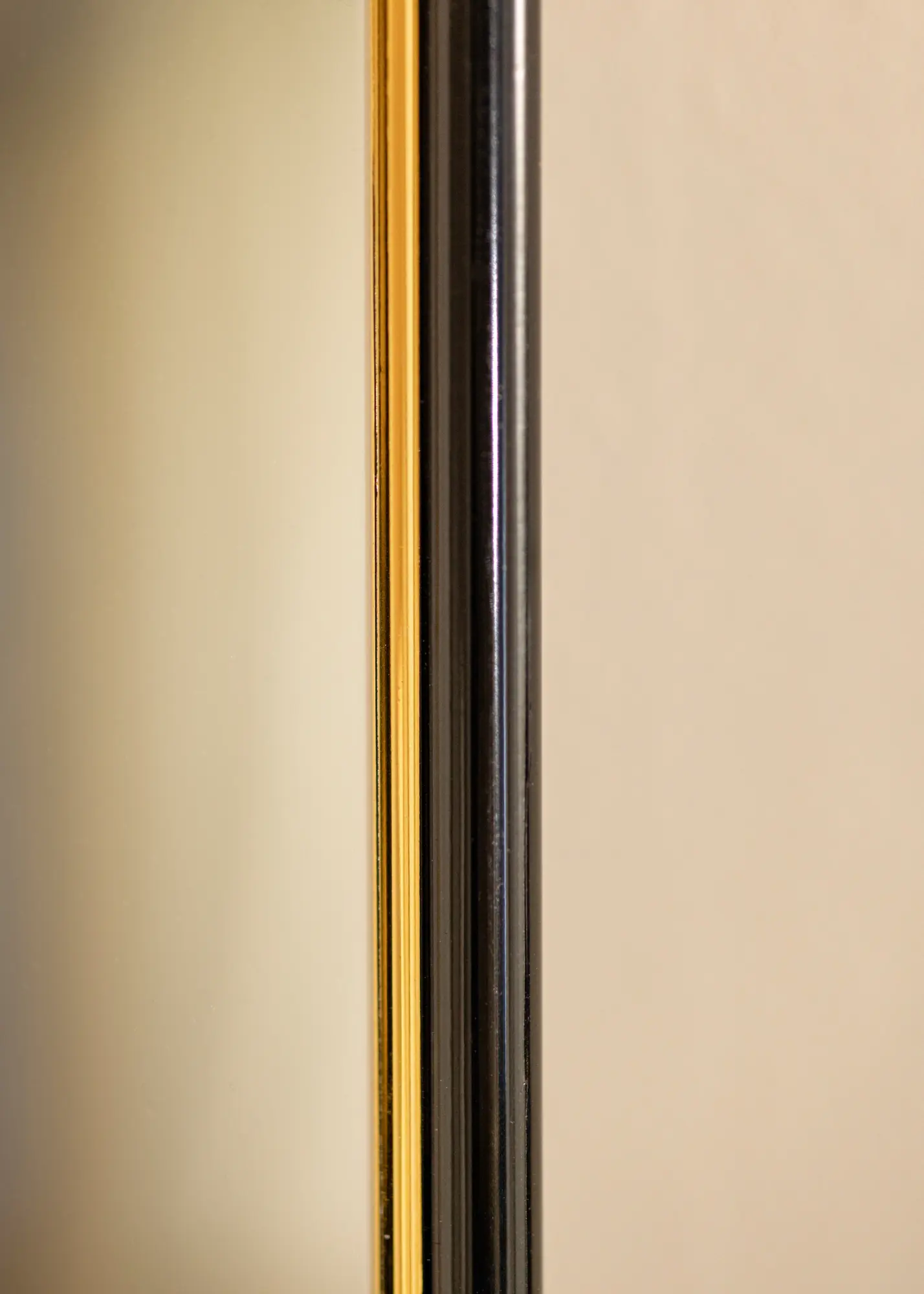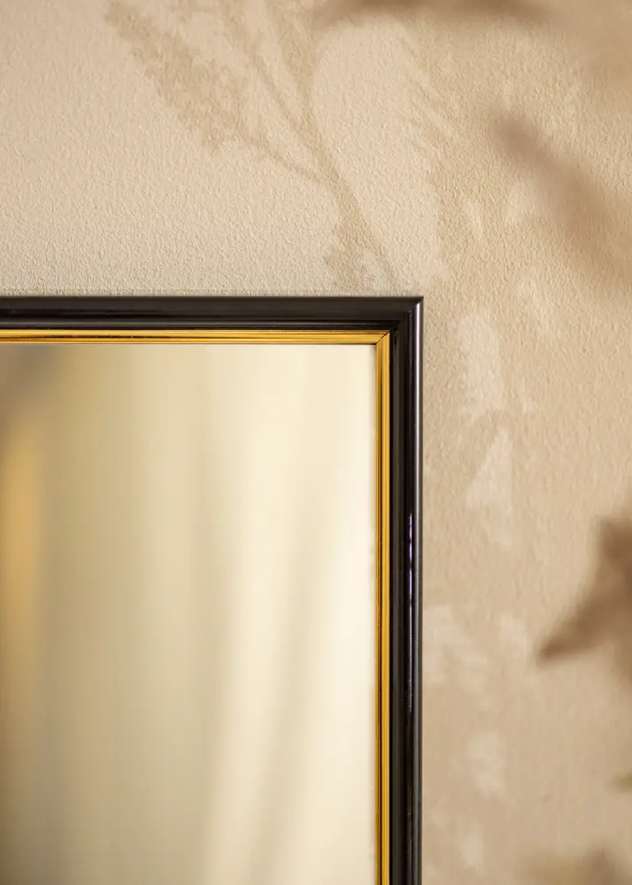 Schimbă atmosfera din hol, baie sau sufragerie atunci când agăți această oglindă luxoasă! Oglinda este neagră, cu o parte aurie aproape de geam. Culorile se potrivesc frumos cu detalii de decor, cum ar fi negru, auriu, violet sau pastel. Deoarece este fabricată conform dorințelor tale, poți fi sigur că se potrivește perfect acolo unde dorești să o așezi.