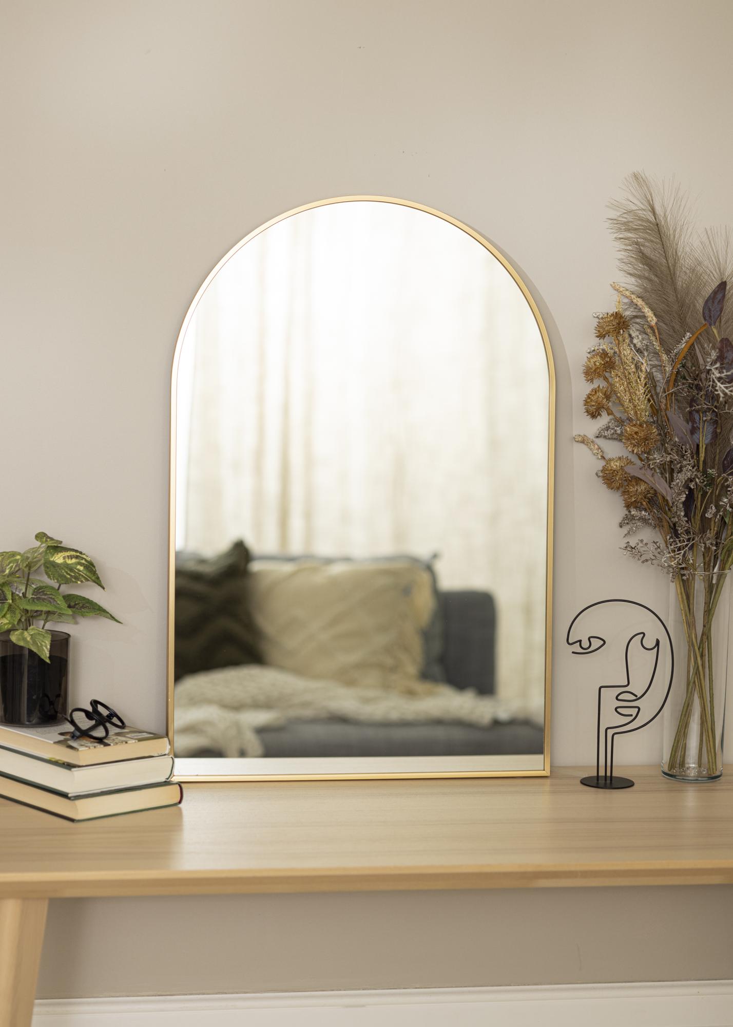 Aceasta este o oglindă de perete modernă care poate fi utilizată în orice cameră. Poți fie să o transformi într-un detaliu la modă în dormitor sau sufragerie, fie să o folosești ca oglindă de baie sau de hol pentru a te putea vedea corespunzător când te pregătești pentru zi. Oglinda are o ramă din metal de 28 mm adâncime, cu o nuanță exclusivistă de aur care îi oferă o eleganță desăvârșită. Forma sa elegantă inspirată de arcuri marine accentuează și mai mult expresia luxoasă.