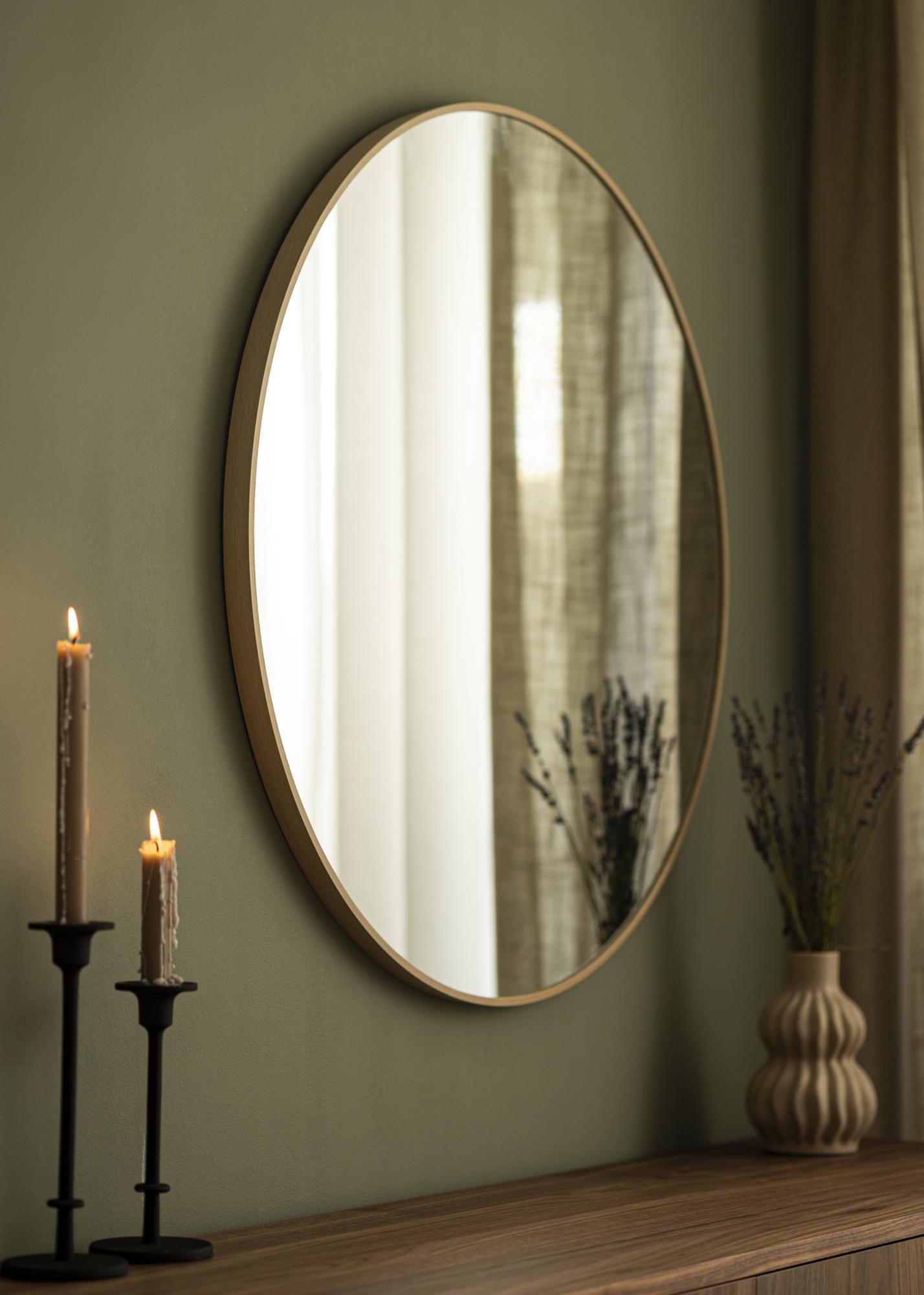 Dă casei tale o notă de eleganță sofisticată cu oglinda noastră rotundă exclusivă. Această oglindă frumoasă este perfectă pentru a crea o senzație deschisă și primitoare în spațiul tău. Cu rama sa de culoarea nucului, fabricată din lemn de înaltă calitate, devine un detaliu natural și cald în decorul tău.