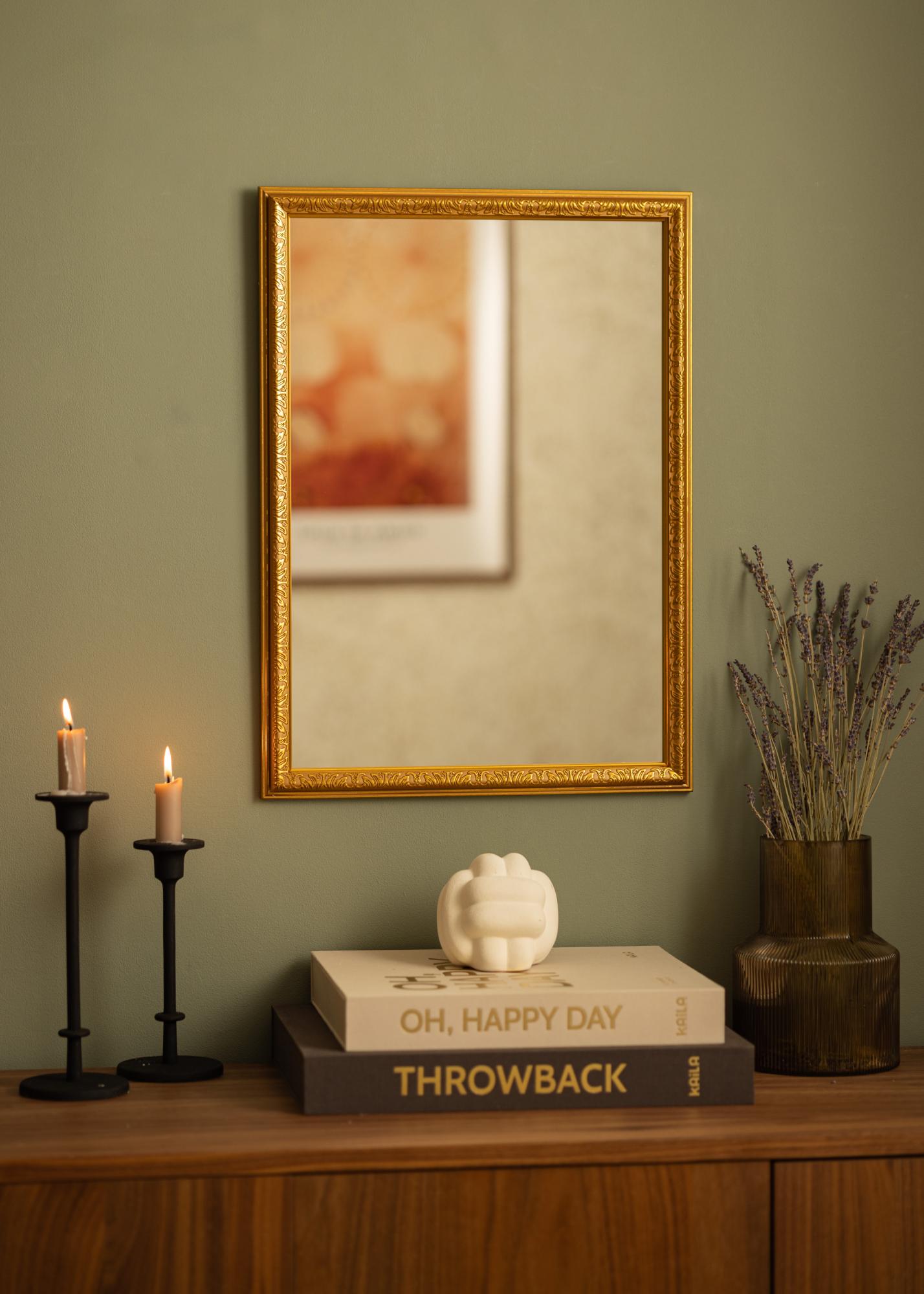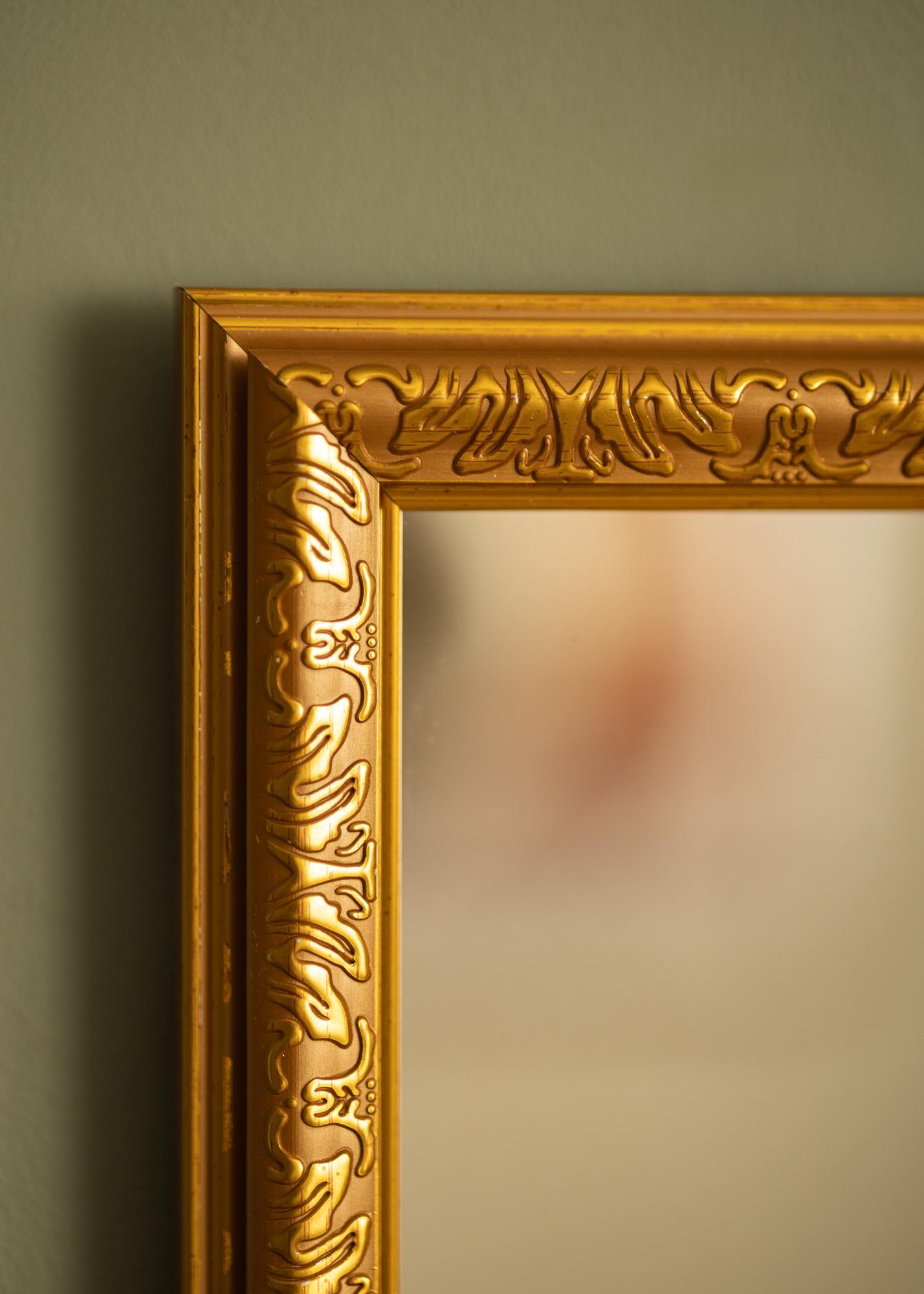 Ești în căutarea unei oglinzi aurii de lux? Poți înceta să cauți acum. Nostalgia Aurie este o oglindă de perete cu o ramă de 2,8 cm lățime, cu un profil elegant și un frumos model decorativ. Sticla oglinzii va reflecta lumina în camera ta, în timp ce oglinda în sine va deveni un detaliu stilat pe peretele tău. Pe partea din spate există un suport de perete pentru o montare mai ușoară.