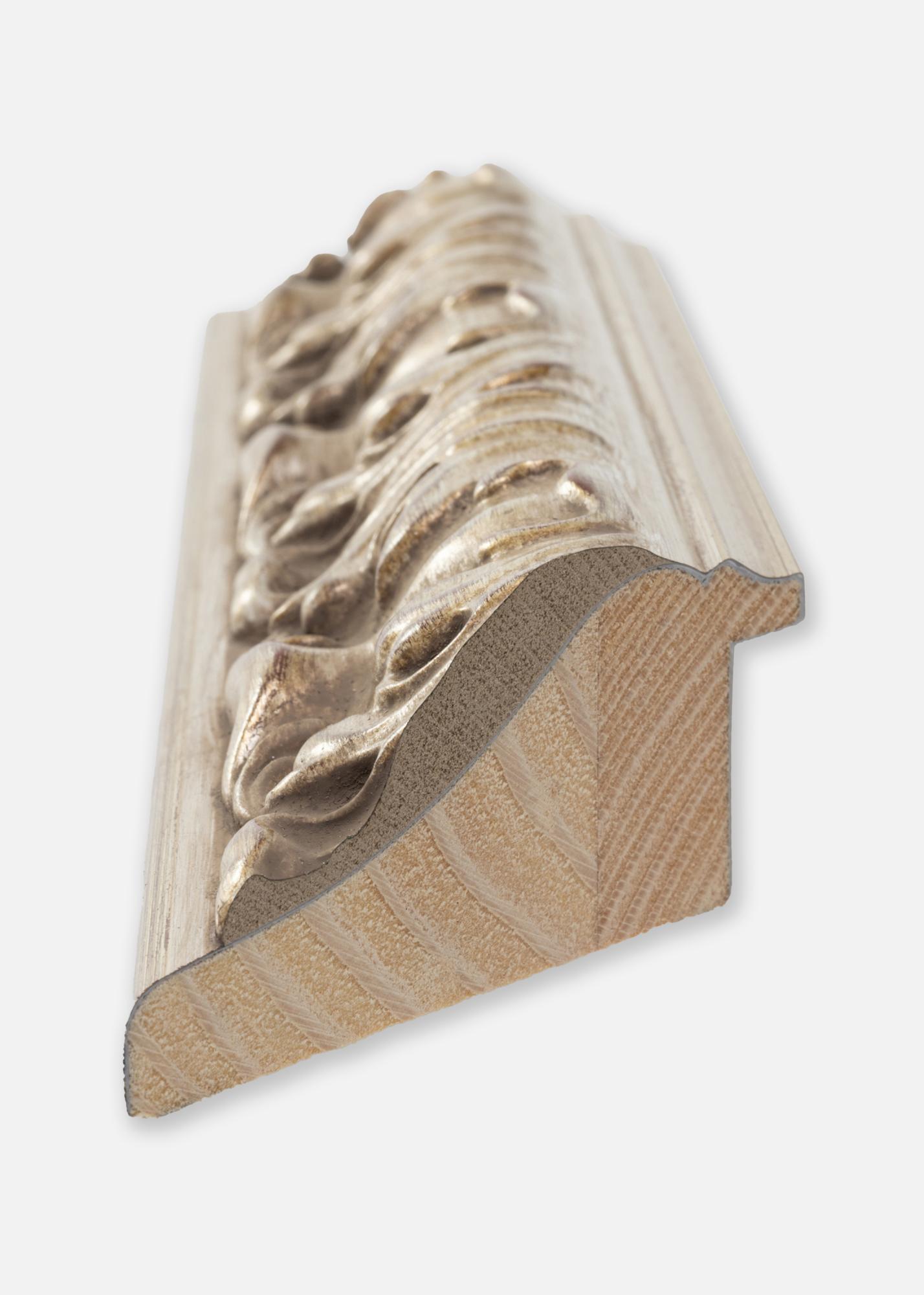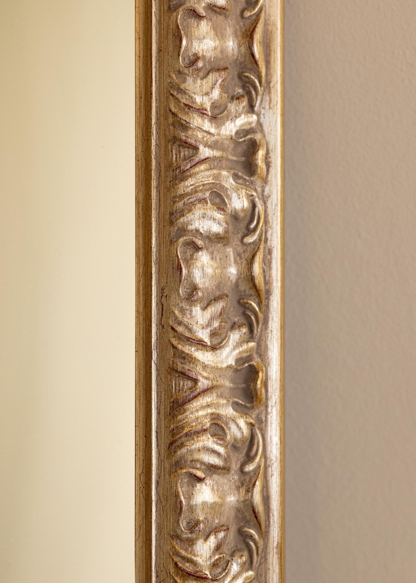 Rama este fabricată din pin și are un finisaj de argint antic cu detalii subtile de aur și accente roșii. Această combinație de culori creează un contrast frumos și oferă oglinzii o expresie clasică și sofisticată. Aspectul decorativ face ca oglinda să fie perfectă pentru încadrări unde se dorește o senzație elegantă.