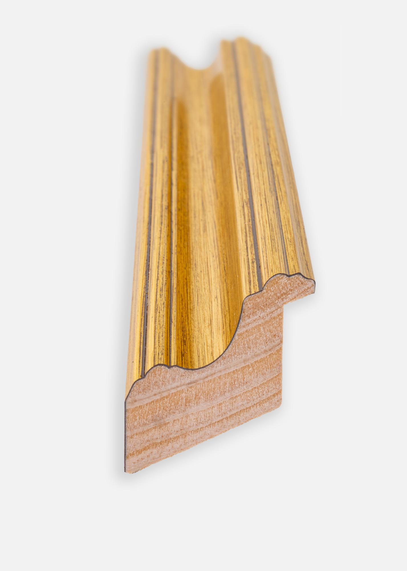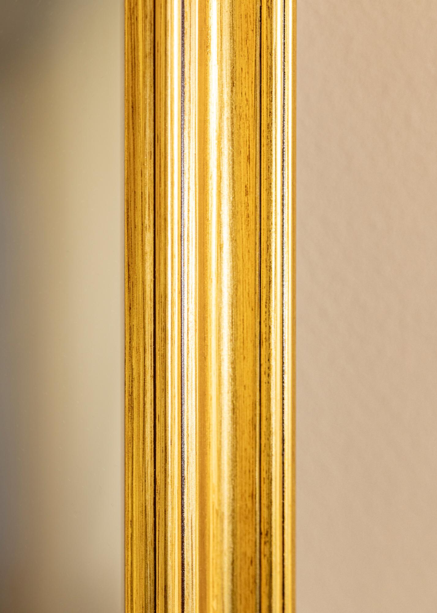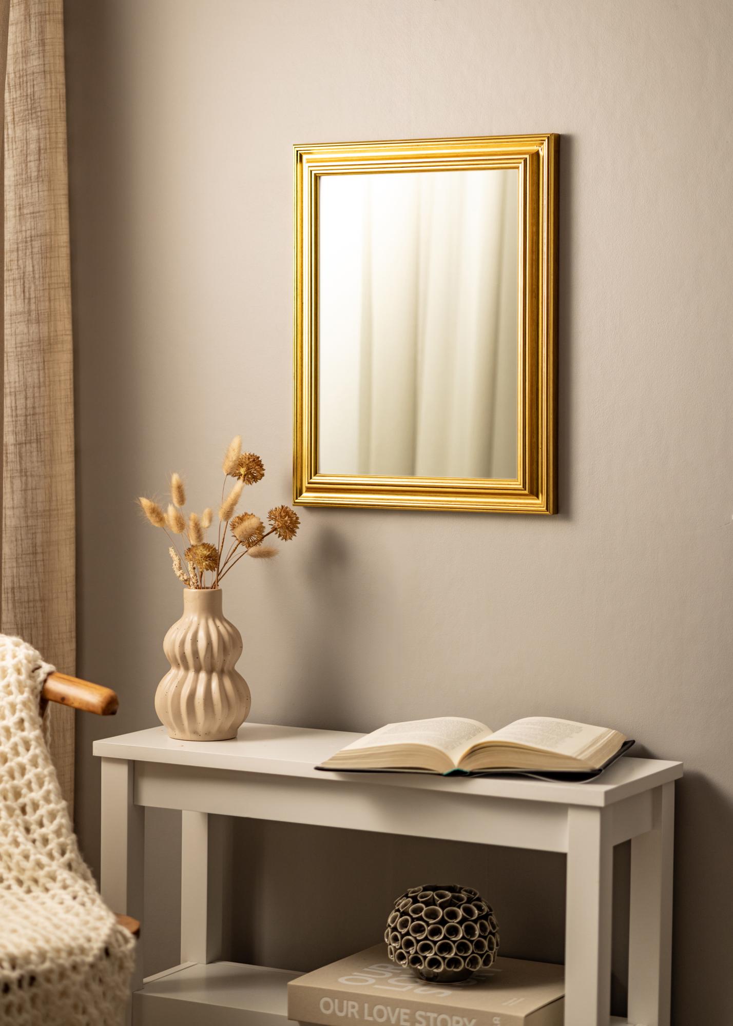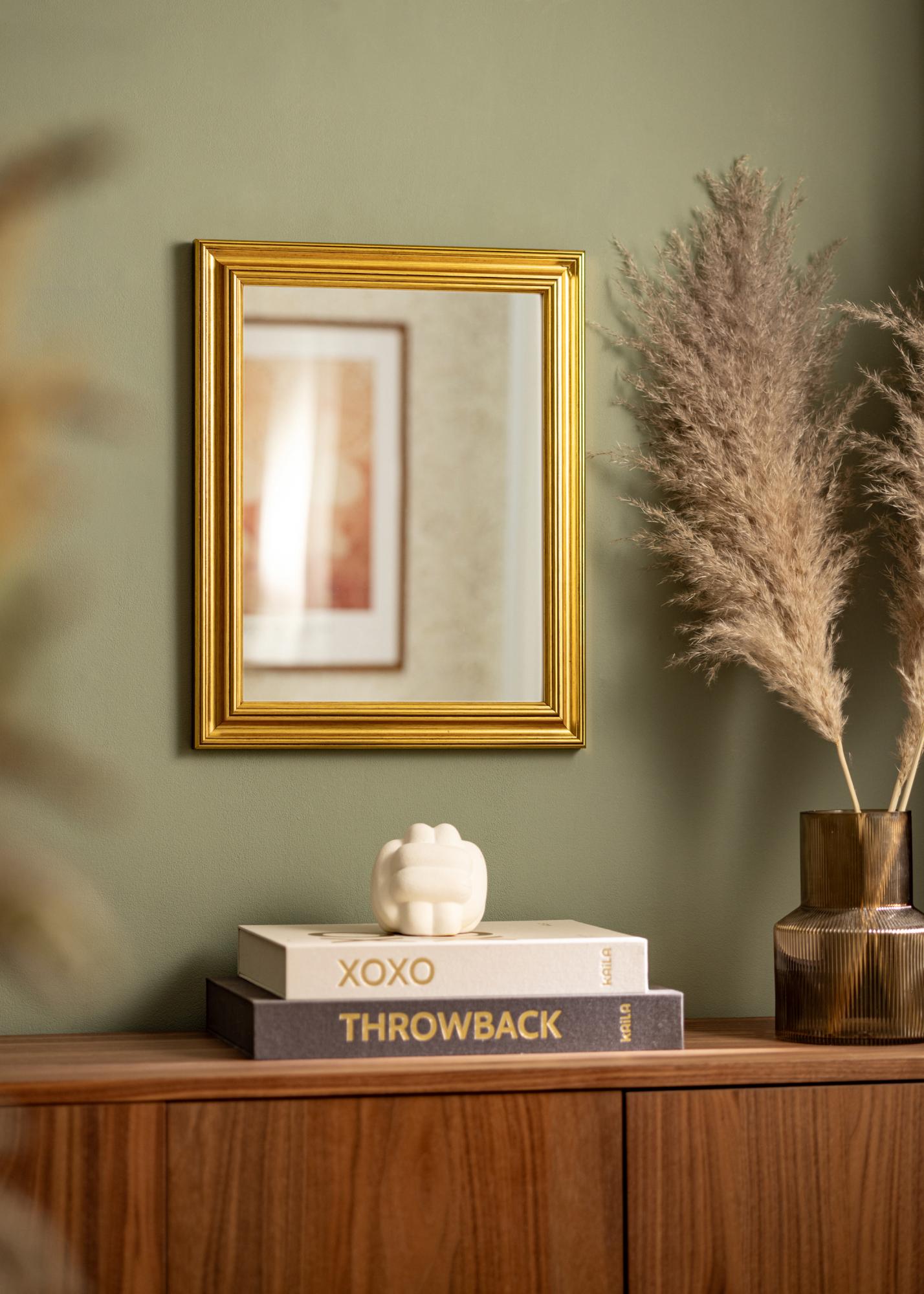 Oglindă clasic profilată de culoare aurie, cu ramă din lemn ce pare pictată manual, oferind oglinzii o senzație vie și o strălucire fină. Rama largă oferă oglinzii un aspect exclusivist și face ca oglinda să se potrivească la fel de bine într-o casă decorată cu antichități, precum și într-o casă modernă cu un decor romantic sau elegant. Combină oglinda cu câteva aplici din alamă și tablouri în rame aurii pentru a crea o senzație de unitate în cameră.