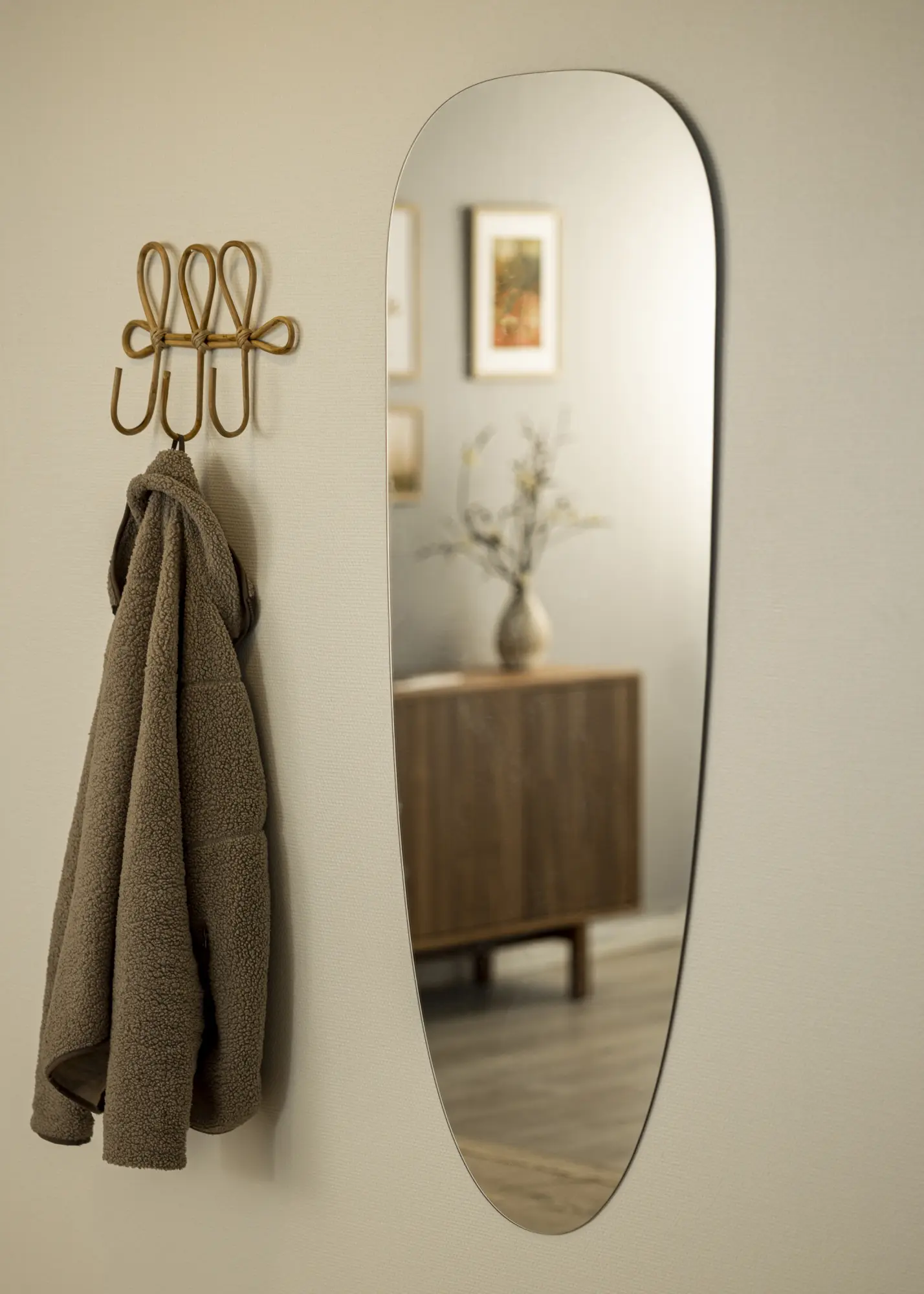 Această oglindă este proiectată pentru a fi agățată vertical, ceea ce o face ideală pentru pereții mai înguşti sau pentru spațiile unde spațiul orizontal este limitat. Forma sa fluidă și organică creează o atmosferă moale și primitoare în cameră, în timp ce funcționează ca o componentă practică și decorativă. Designul oglinzii este atent gândit pentru a se integra în diferite stiluri de decor, de la cele minimaliste la cele mai tradiționale.