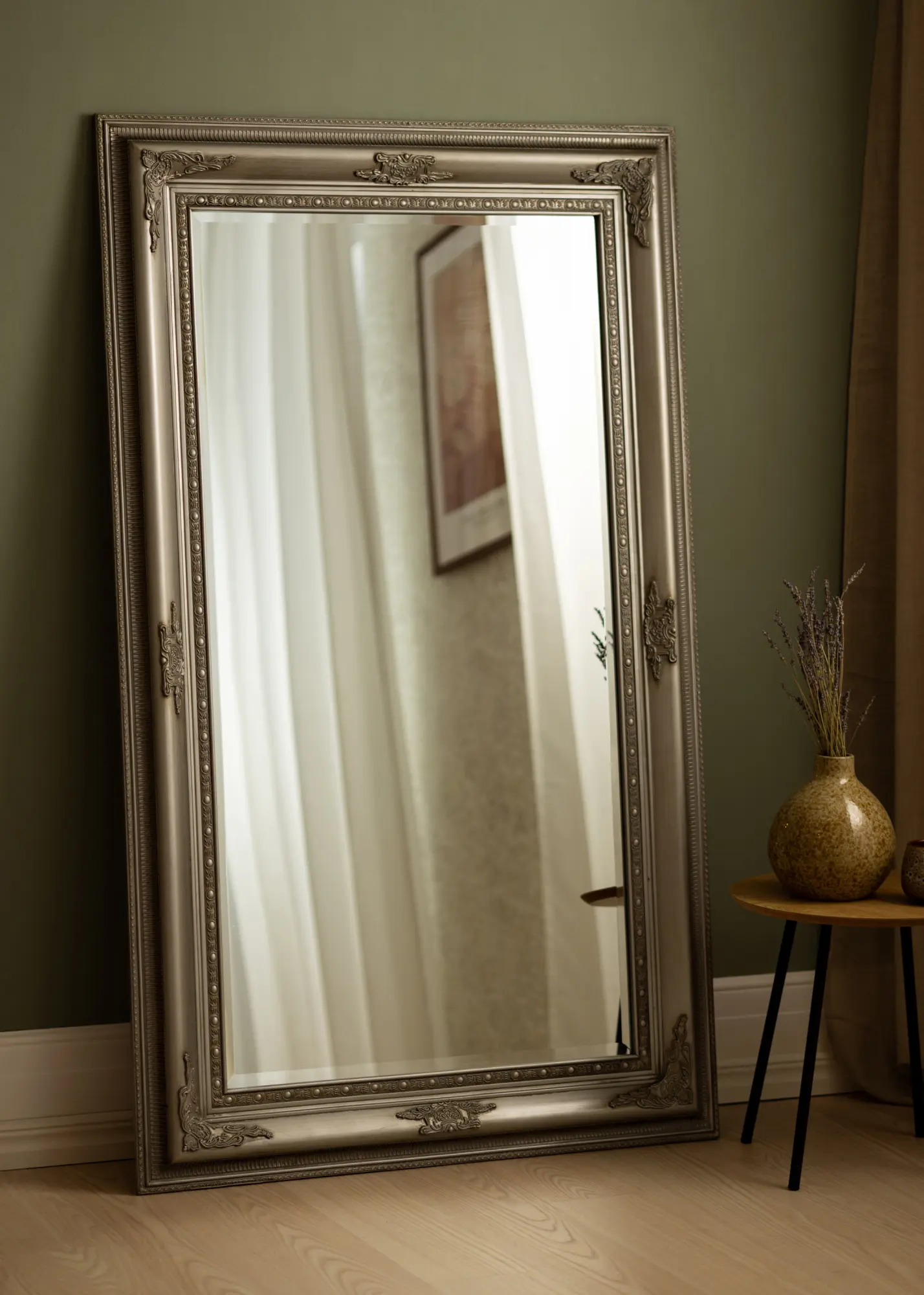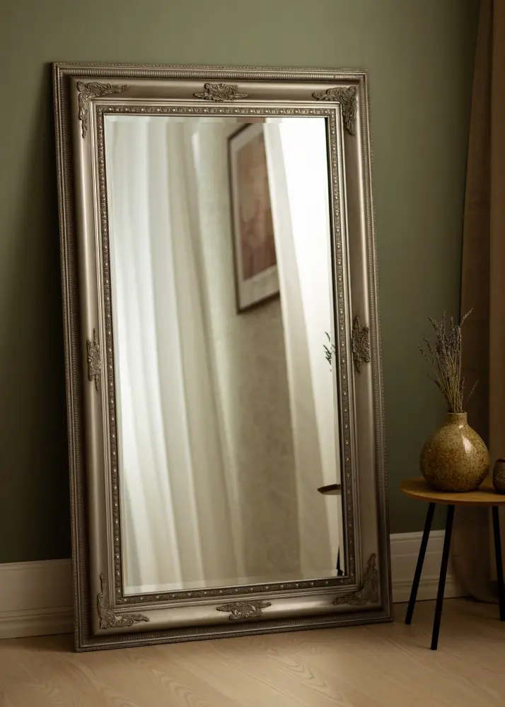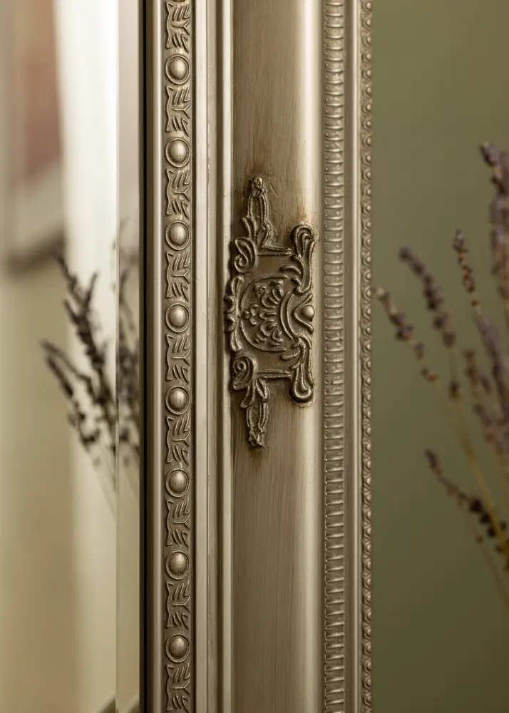Oglindă argintie într-un stil clasic cu un profil modelat și ornamente de flori în jurul ei. Senzația antică a oglinzii o face să se potrivească frumos într-un decor cu mobilier de epocă, dar devine, de asemenea, un contrast interesant într-o interior modern minimalist. Formatul face ca oglinda să arate bine atât în hol, cât și în dulapul mare sau pe un perete în dormitor unde hainele au un rol important în decor. Evidențiați oglinda cu accesorii decorative de argint în cameră.