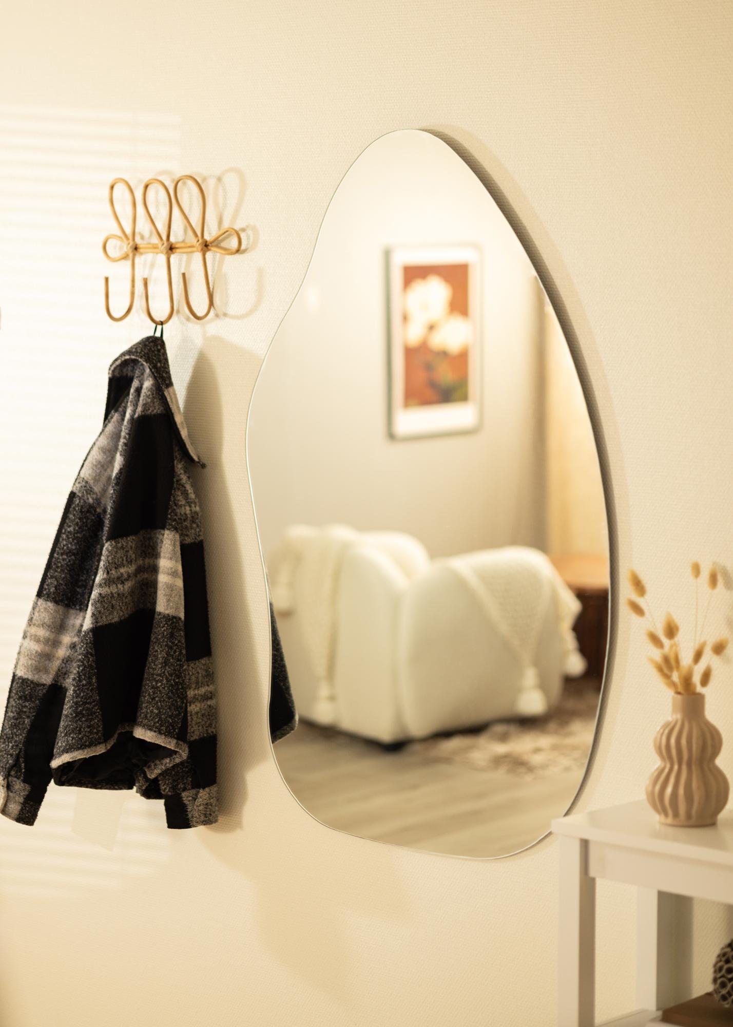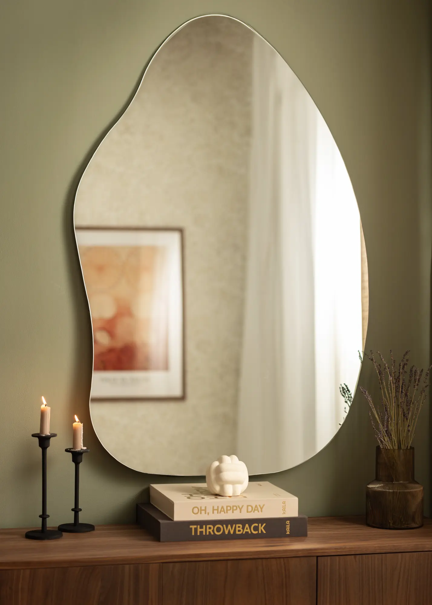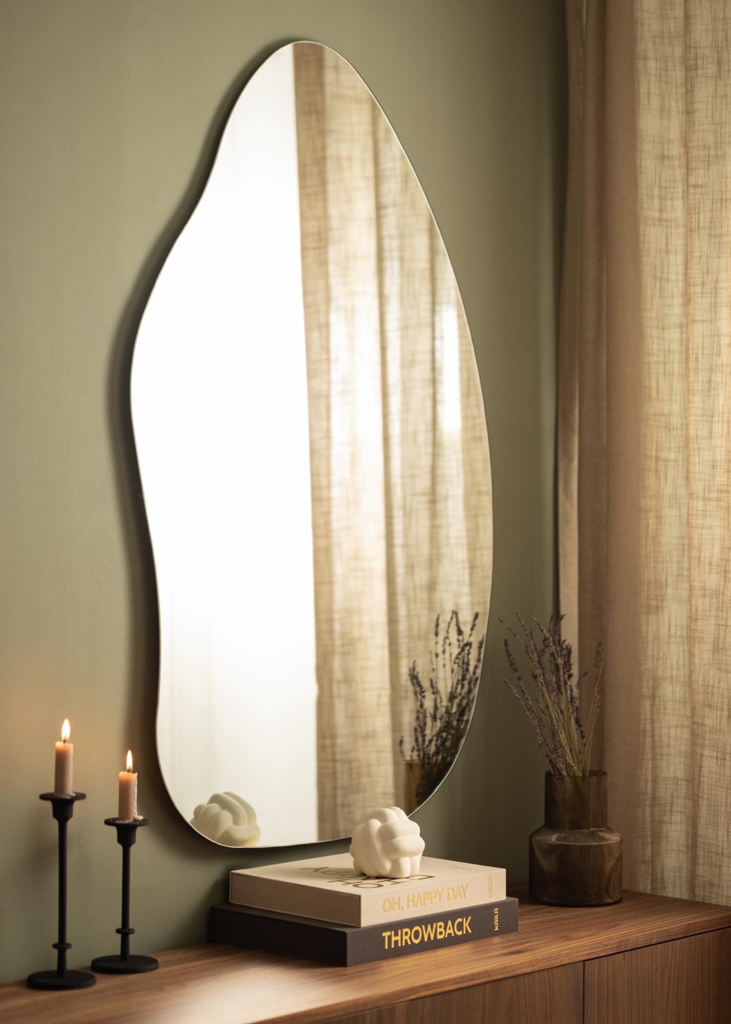 Oglinda are o formă moale și organică ce amintește de un strop de apă sau o frunză verticală, conferind o senzație elegantă și modernă camerei. Această formă unică face ca oglinda să devină un subiect de conversație și o operă de artă în sine, în același timp îndeplinindu-și funcția practică.