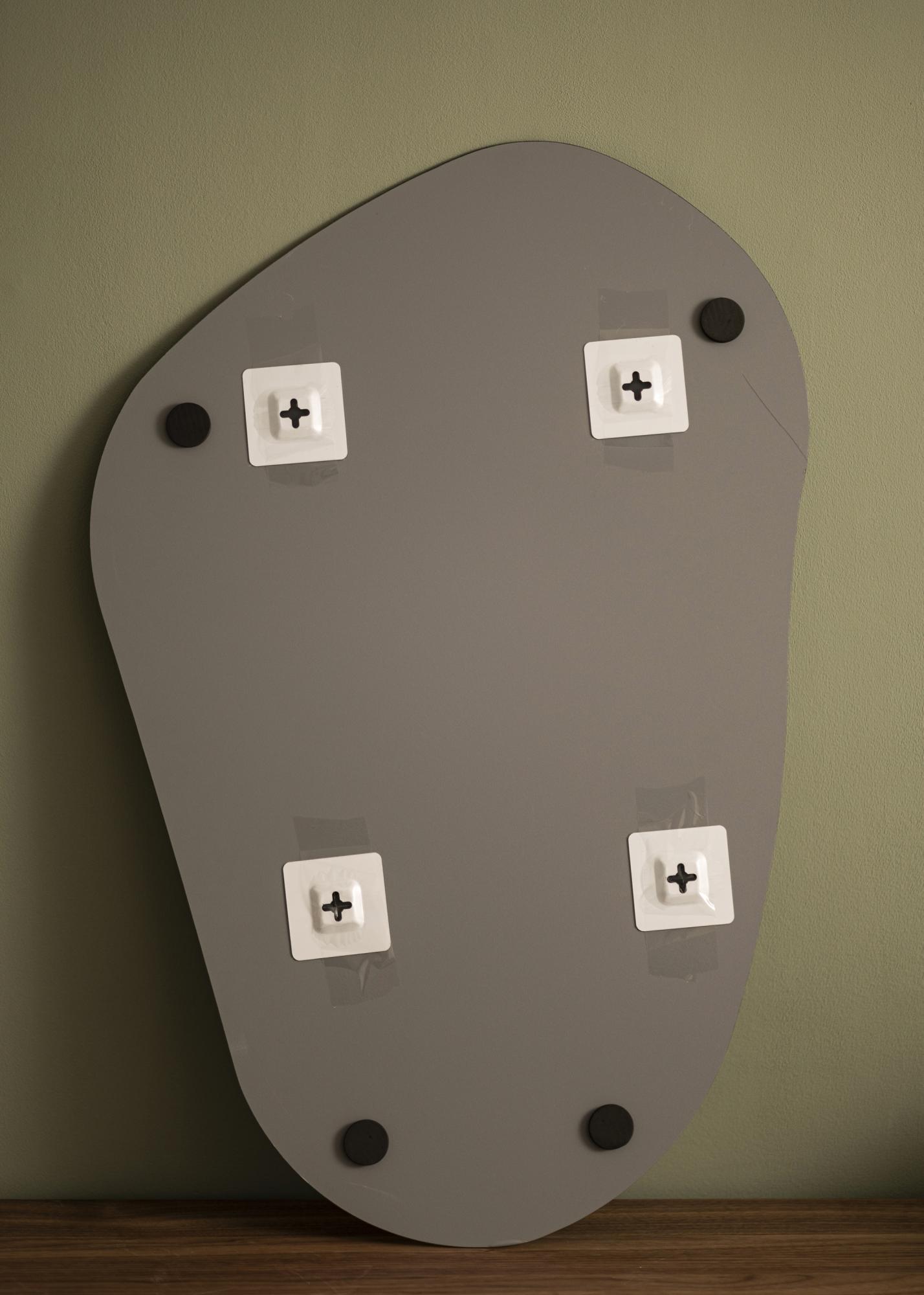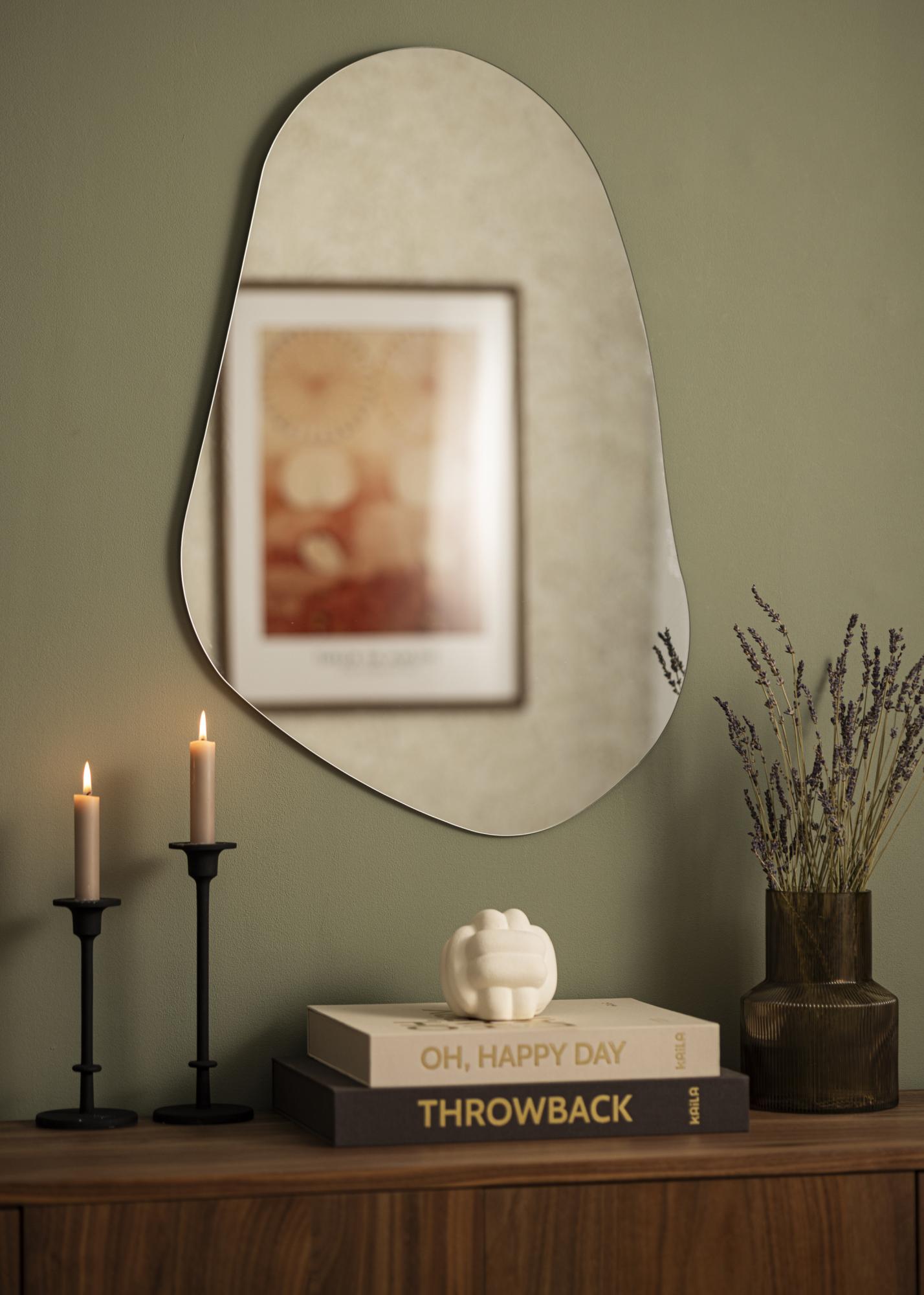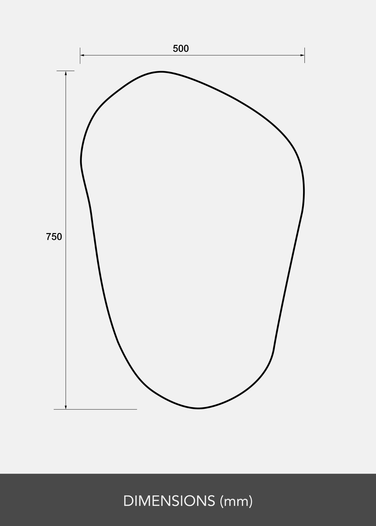 Această Oglindă are o formă organică, asimetrică și lin curbată, care oferă un aspect modern și artistic. Cu liniile sale rotunjite și lipsa marginilor drepte, amintește de o siluetă desenată liber, asemenea unei pietre formate natural sau unei picături alungite.