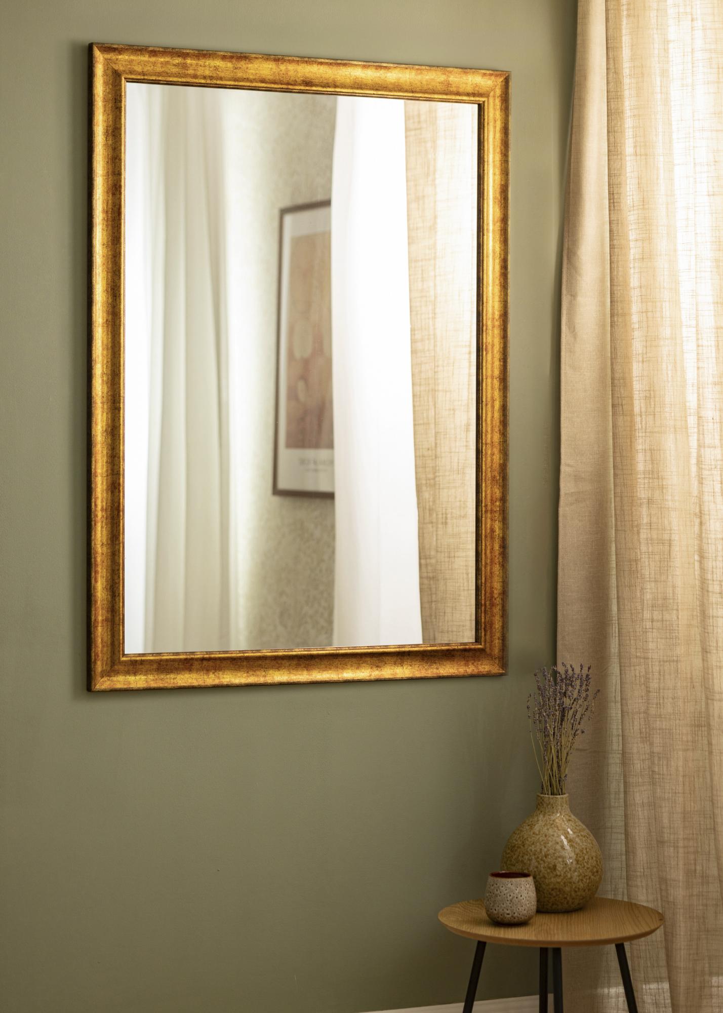 Această oglindă de perete frumoasă are o ramă decorativă aurie, fabricată din compozit. Rama are un aspect elegant „uzat” care oferă oglinzii o expresie mai veche ce se potrivește excelent în casele calde și primitoare. Agățătoarea practică de pe panoul din spate îți permite să atârni oglinda atât în poziție verticală, cât și orizontală. Această oglindă măsoară 70x100 cm.
