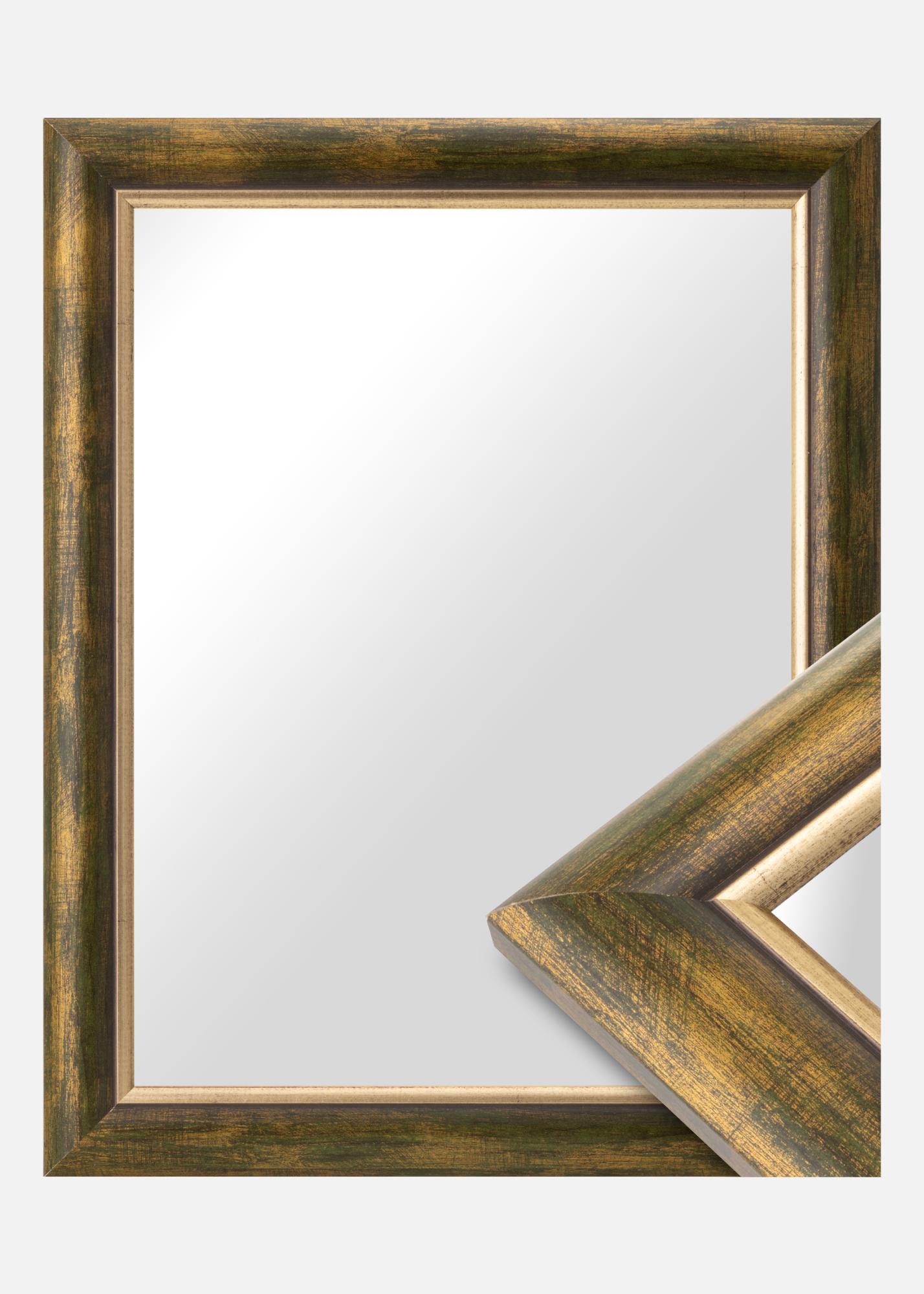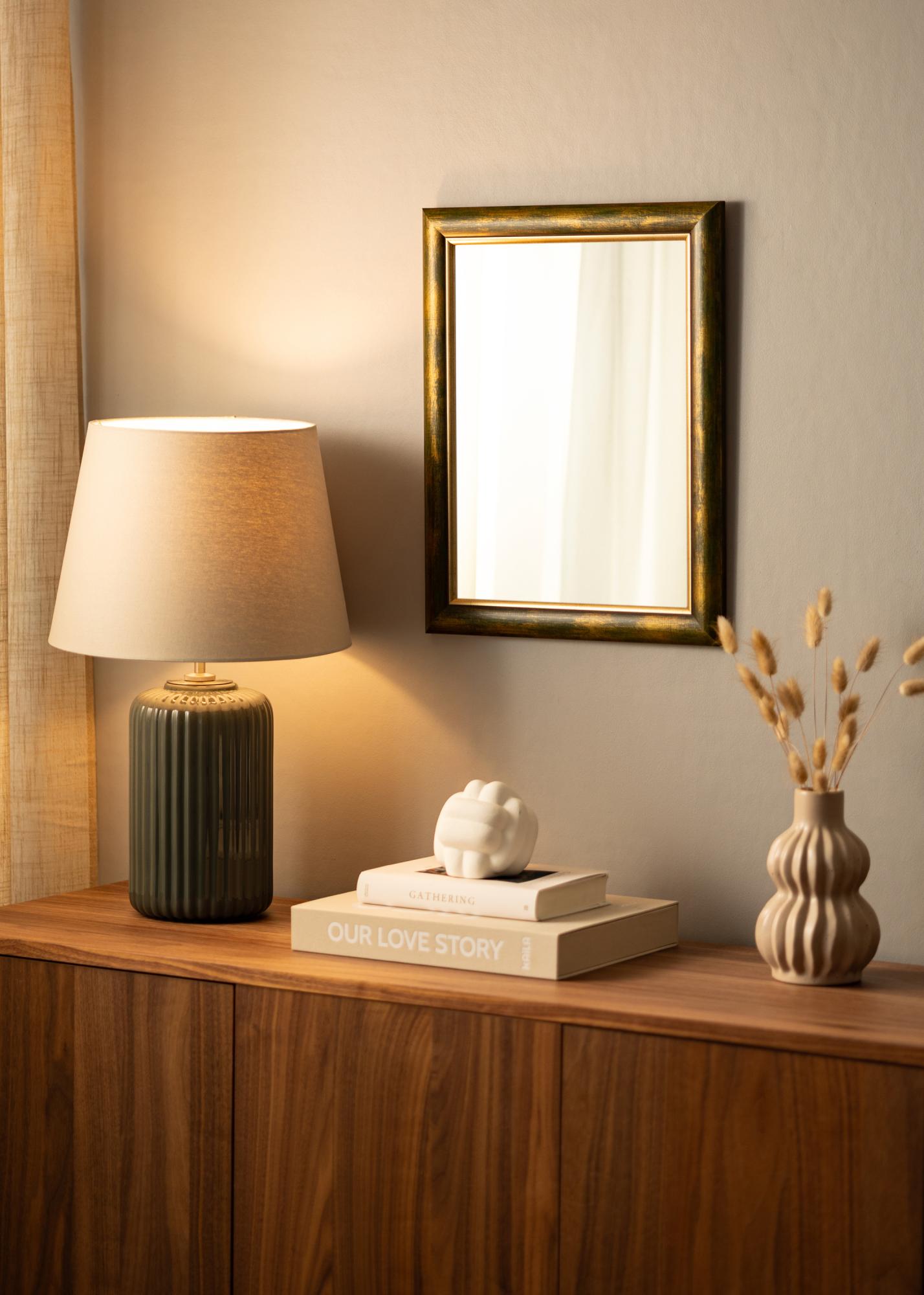 Listă de lemn atemporală fabricată în Finlanda cu o suprafață de lemn elegantă cu tonuri verzi și o margine aurie lângă geamul oglinzii. Rama are un profil larg de 41 mm și o adâncime de 19 mm, ceea ce conferă un plus de adâncime oglinzii tale.