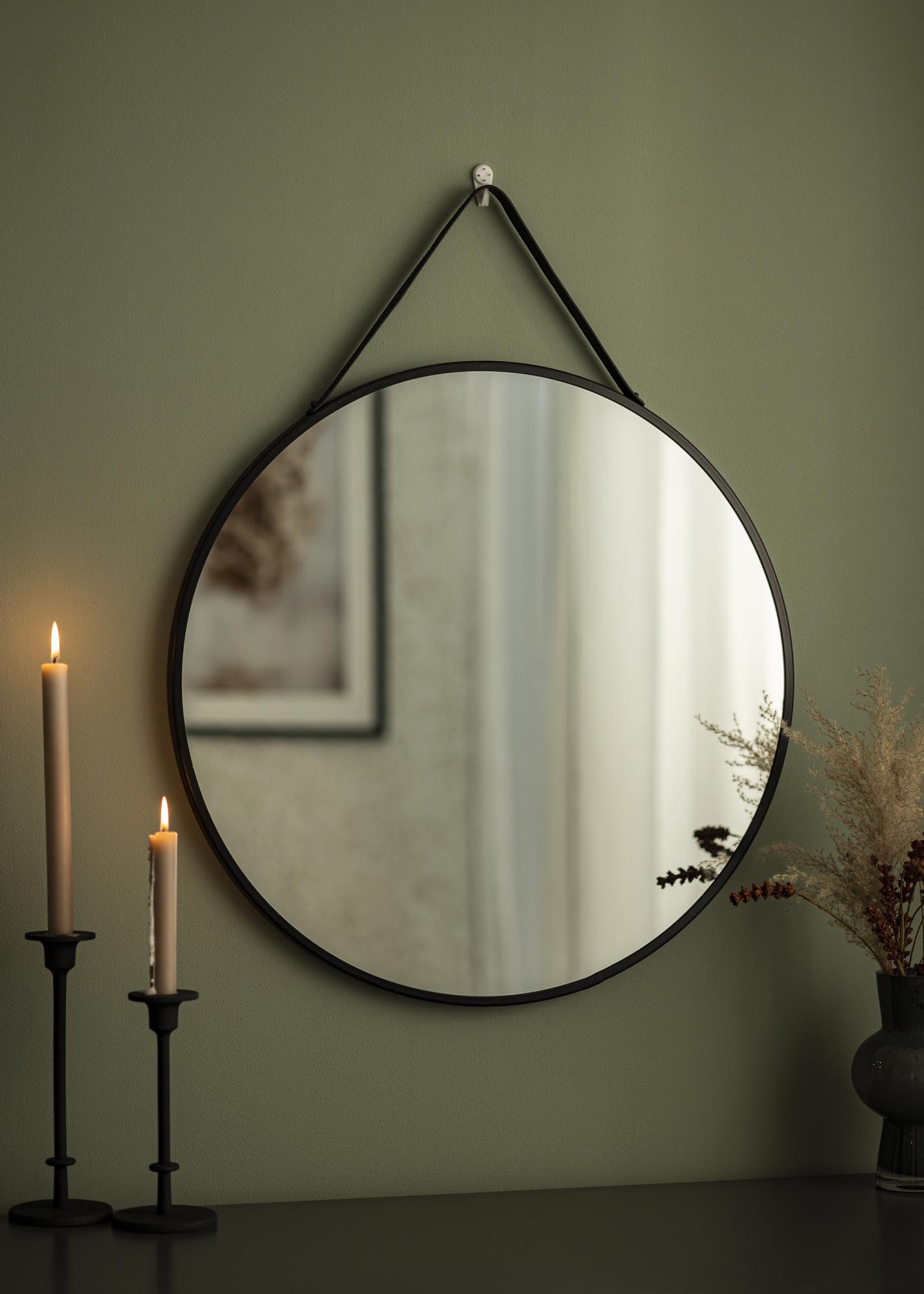 Trapani este o oglindă de perete elegantă, cu un mic plus. Oglinda este rotundă și înconjurată de o ramă simplă din metal negru. Oglinda este fixată pe perete cu o bandă foarte decorativă din piele artificială.