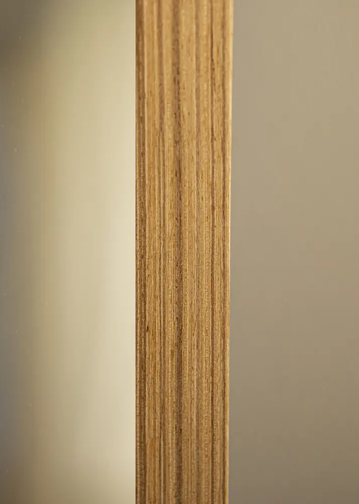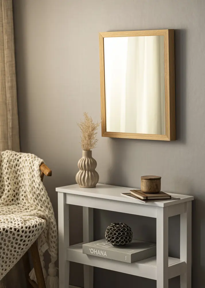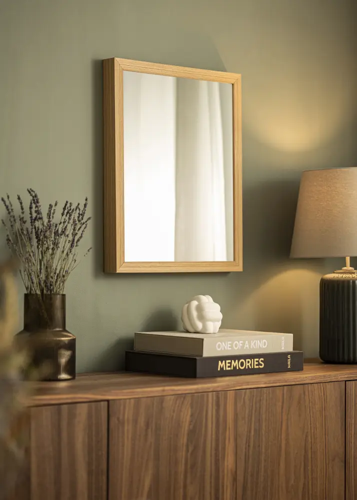 Această oglindă are un finisaj elegant cu model de stejar, care oferă un aspect natural și stilat. Rama lată de 48 mm încadrează oglinda într-un mod plăcut și contribuie la aspectul său robust. Cu o adâncime de 42 mm, rama oferă de asemenea, o senzație de stabilitate și calitate, ceea ce face ca oglinda să devină o parte durabilă a decorului tău.
