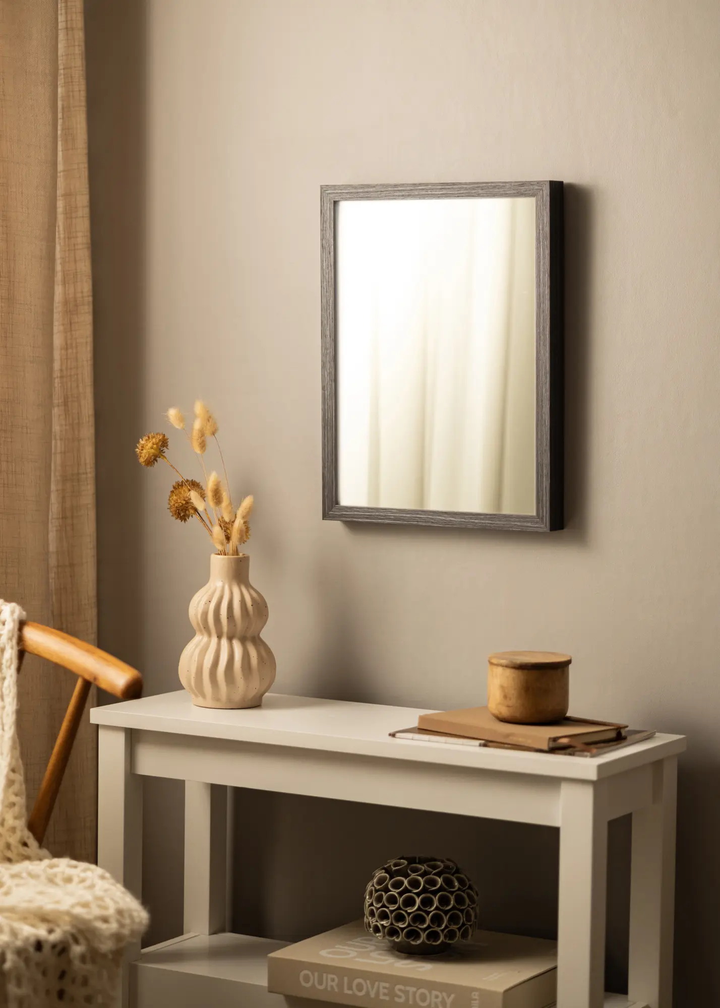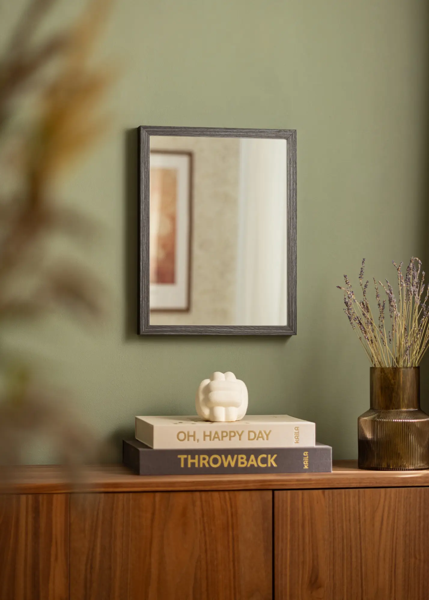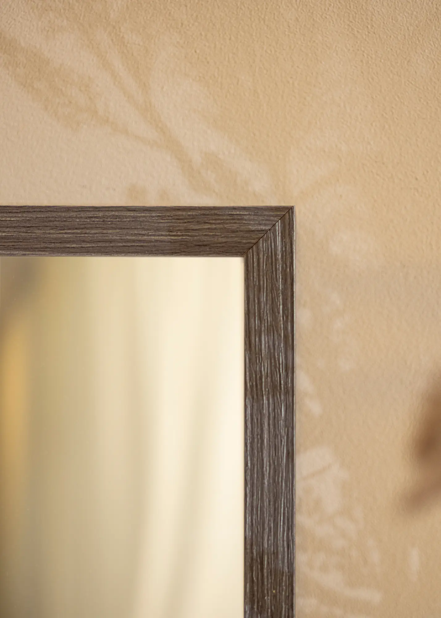 Oglinda Wood Selection Grey I este o oglindă la comandă fabricată de noi pentru a corespunde nevoilor tale. Cu culoarea sa gri și finisajul de lemn închis la culoare, această oglindă oferă un design elegant și atemporal care se integrează în majoritatea stilurilor de interior. Fibra naturală a lemnului se întinde de-a lungul marginilor și dă oglinzii un caracter unic, în timp ce suprafața mată amplifică senzația autentică de lemn.