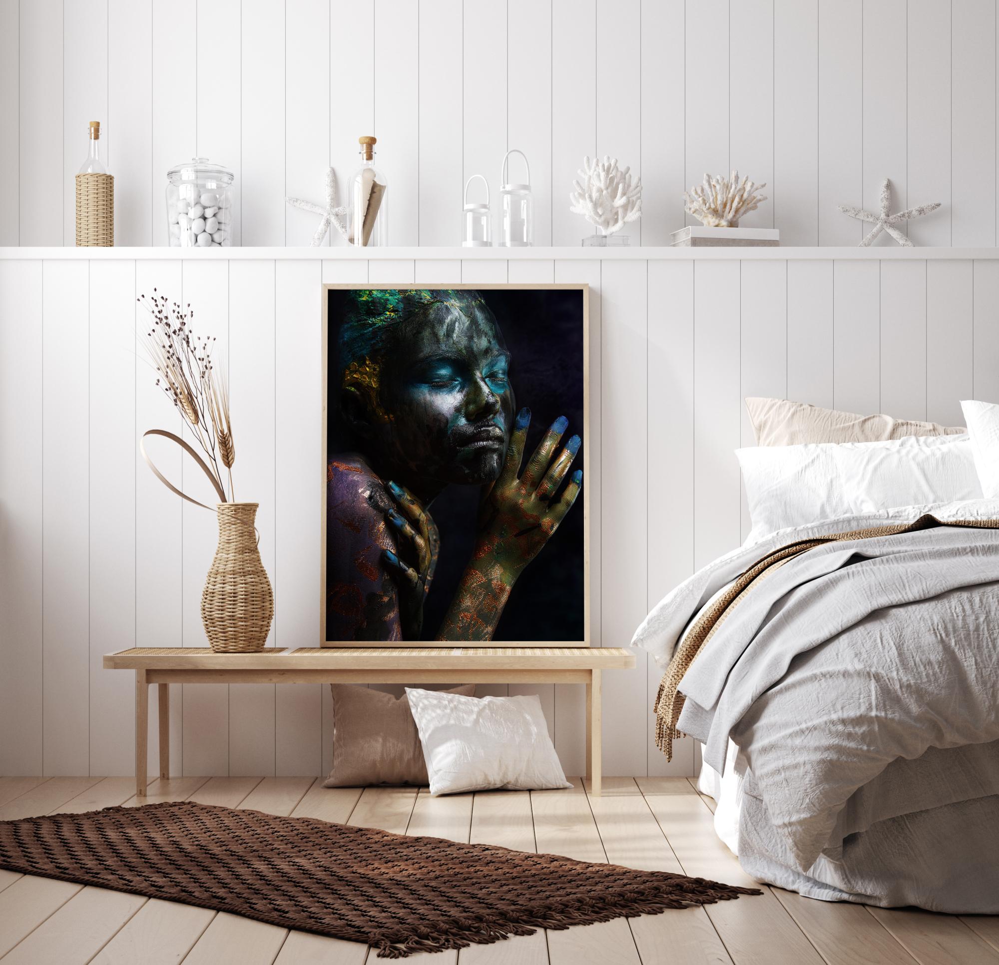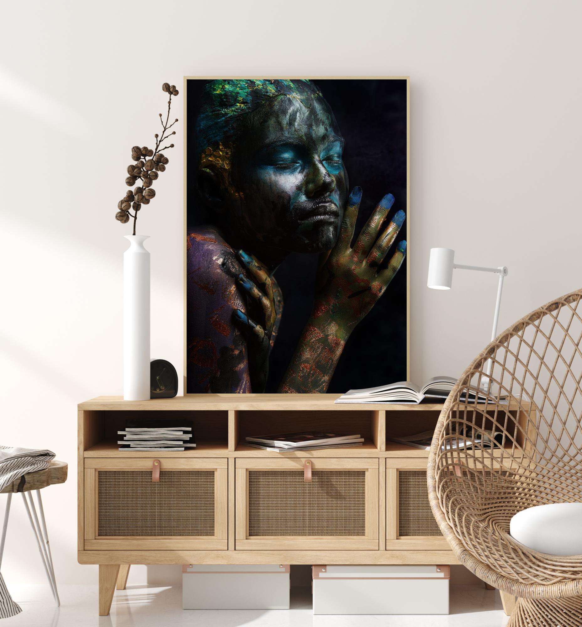 Un imprimeu uimitor al unei femei acoperite de culoare. Pe un fundal negru, femeia a fost acoperită de culori vii. Cu lumina naturală care strălucește pe fața și umerii femeii, se evidențiază intensitatea culorilor. Un poster frumos care poate aduce culoare unui perete alb.
