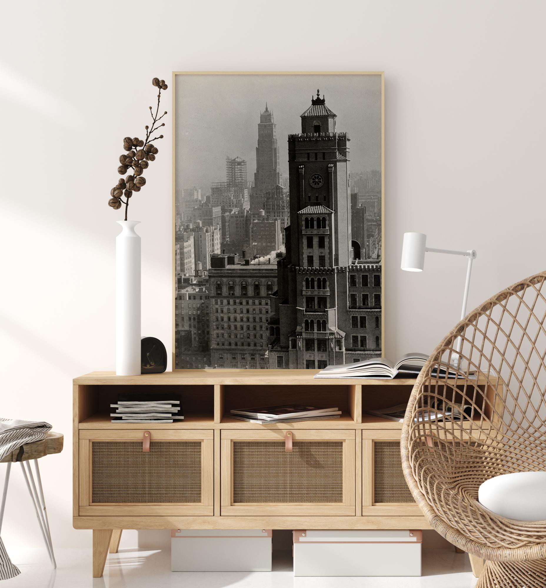 Un imprimeu alb-negru cu un oraș vechi. Linia de oraș gri se îmbină perfect cu clădirile gri de aceeași culoare. Orașul este format din clădiri de înălțimi diferite. În prim-plan, lumina naturală strălucește direct pe partea de est a clădirii principale. Agățați acest poster în biroul dumneavoastră și observați orașul vechi.
