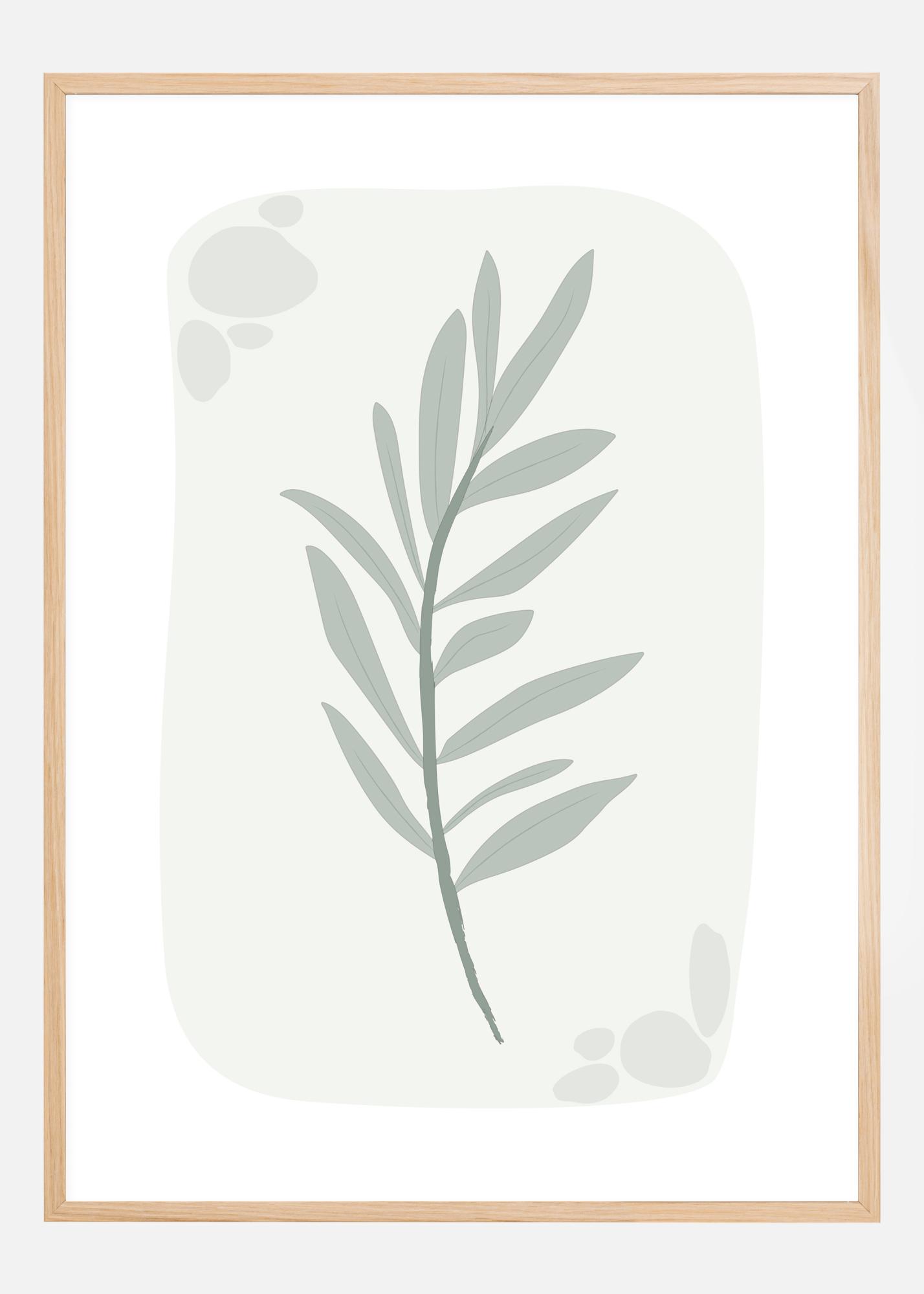 Un imprimeu liniștit al unei frunze de măslin pe un fundal alb-crem. Tonurile moi de verde ale ramurii de măslin se îmbină perfect cu fundalul. În colțul din stânga sus și colțul din dreapta jos au fost pictate patru pietre de culoare bej. Acest poster ar arăta frumos agățat pe un perete alb-crem.
