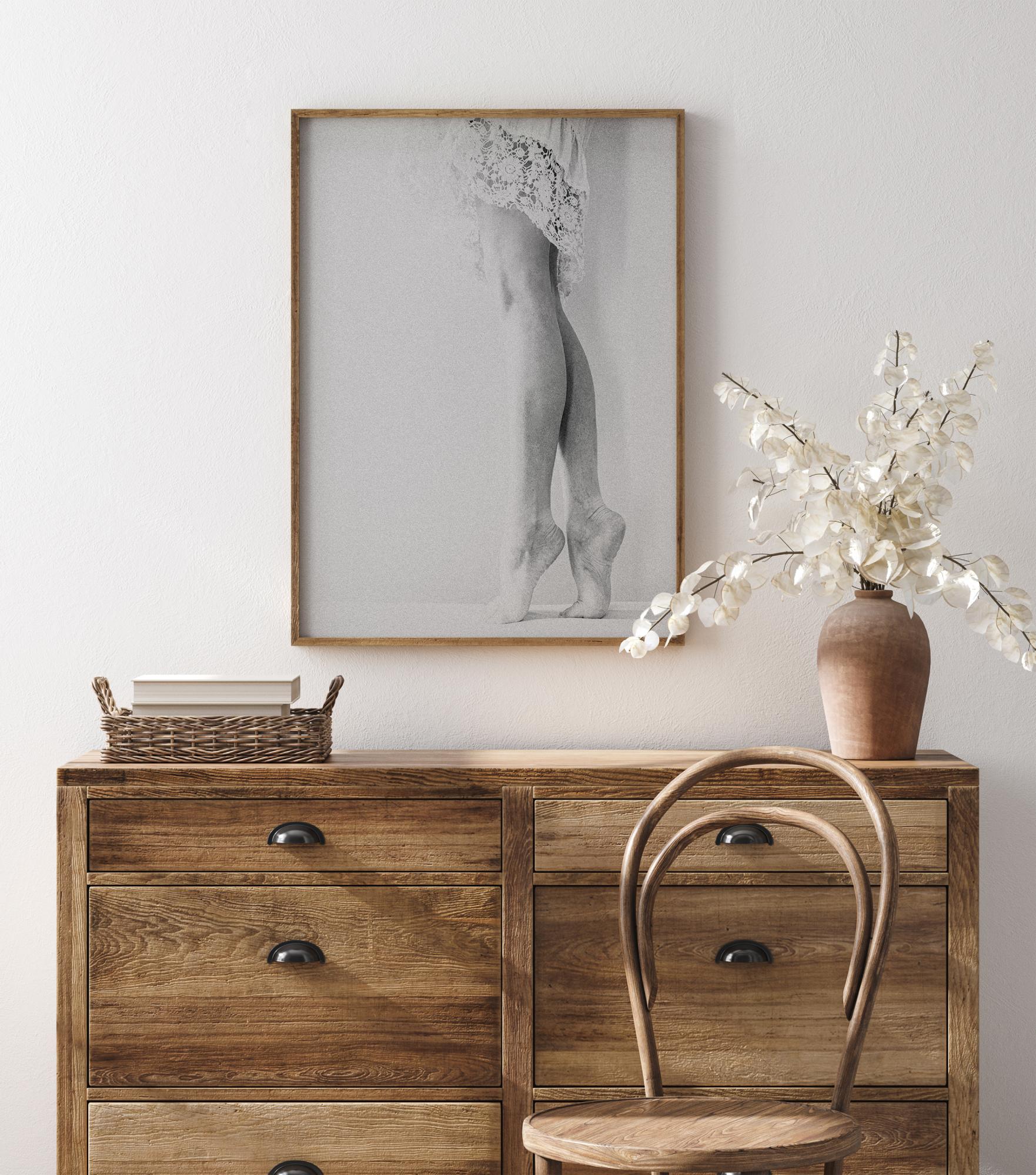 Un portret elegant, pe jumătate, al unei femei care stă pe vârfuri. Simplitatea imaginii, combinată cu subtilitatea albului, face ca această imagine să fie un supliment excelent pentru dormitorul sau sufrageria ta.