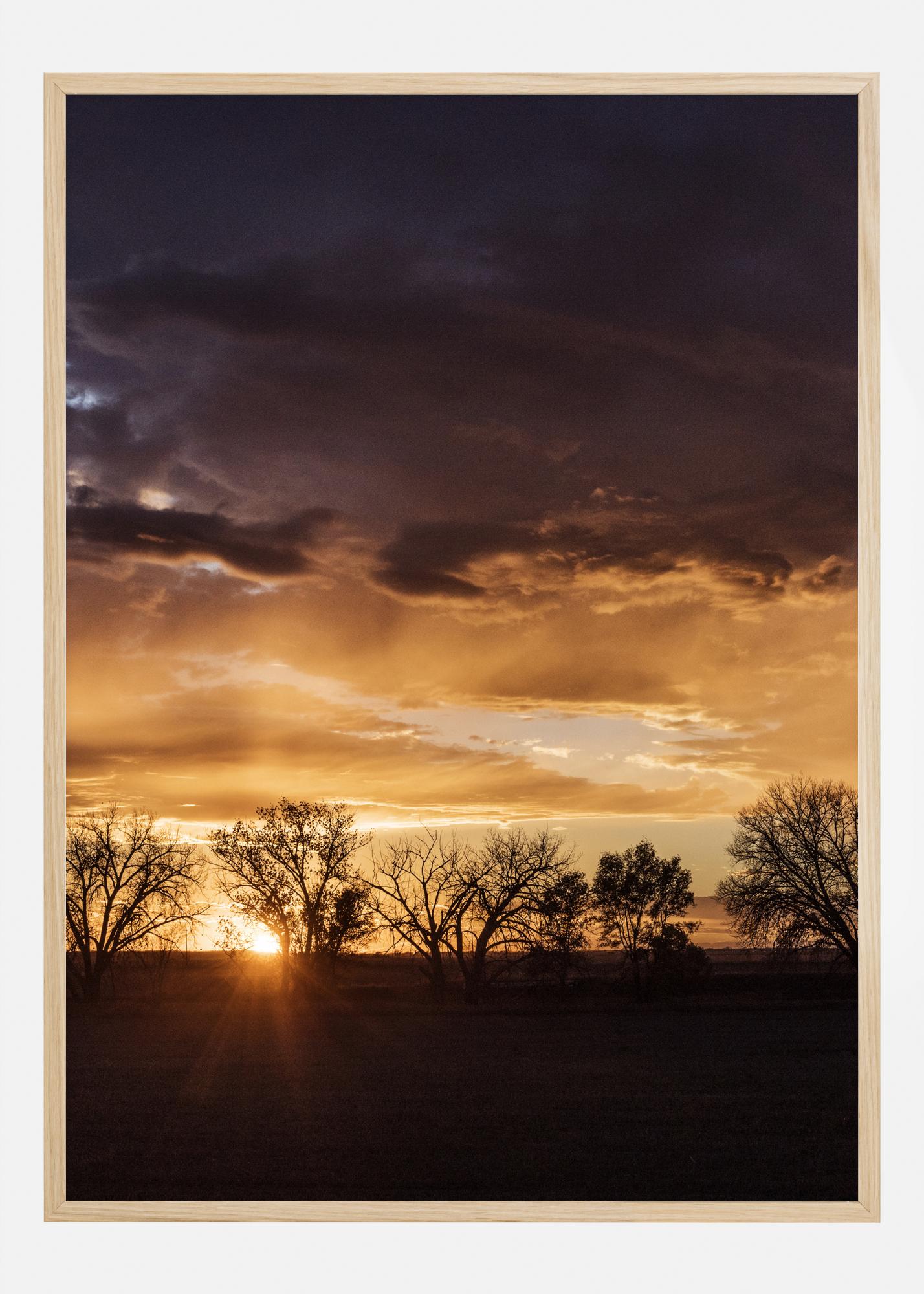 Un imprimeu uluitor cu un apus de soare portocaliu. Apusul la orizont evidențiază copacii de toamnă de pe câmpuri. Cu un cer spectaculos, nuanțele de portocaliu creează o atmosferă caldă și liniștitoare. Un poster fantastic care aduce căldură în camera ta de zi.