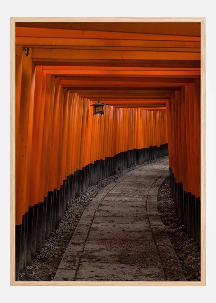 Un poster cu o alee de piatră mărginită de stâlpi de lemn portocalii și negri. În mijlocul aleii atârnă un felinar de fier. Lumina naturală strălucește pe alee, unde au căzut câteva frunze mici de toamnă. Un poster frumos care poate înviora orice perete.
