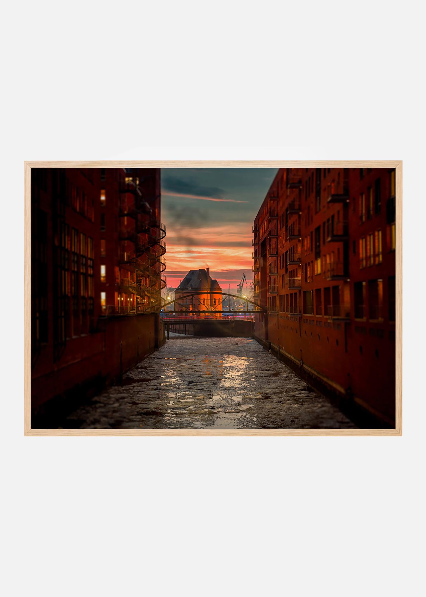 Apus peste vechiul district de depozite Speicherstadt din Hamburg, cu canalele sale și clădirile neogotice din cărămidă. Fotografia din această zonă protejată se potrivește bine în casa unui pasionat de arhitectură sau istorie. Posterul se prezintă cel mai bine într-o ramă metalică subțire care se potrivește cu arhitectura sobră și arată bine pe perete alături de alte imagini urbane.