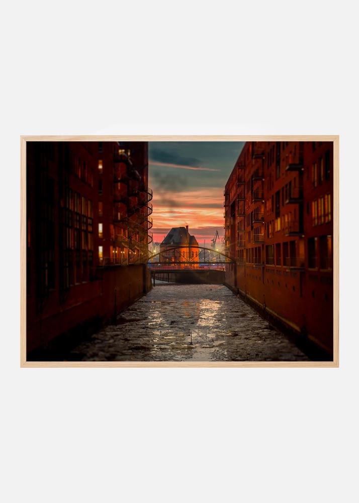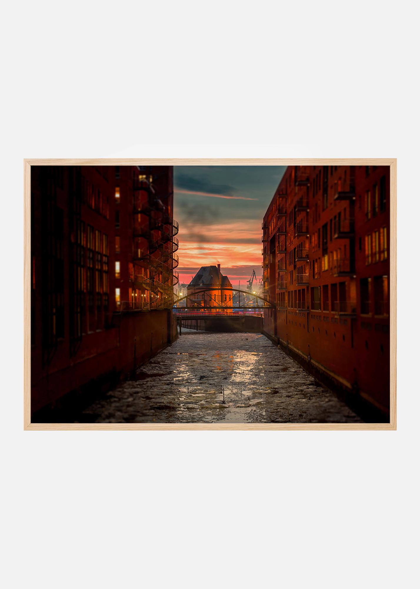 Apus de soare peste vechiul cartier al magazinelor Speicherstadt din Hamburg, cu canalele sale și clădirile de cărămidă în stil neogotic. Fotografia din zona protejată ca monument istoric se potrivește perfect în casa unei persoane interesate de arhitectură sau istorie. Posterul arată cel mai bine într-o ramă subțire de metal, care se potrivește cu arhitectura sobră și arată elegant pe perete alături de alte imagini urbane.