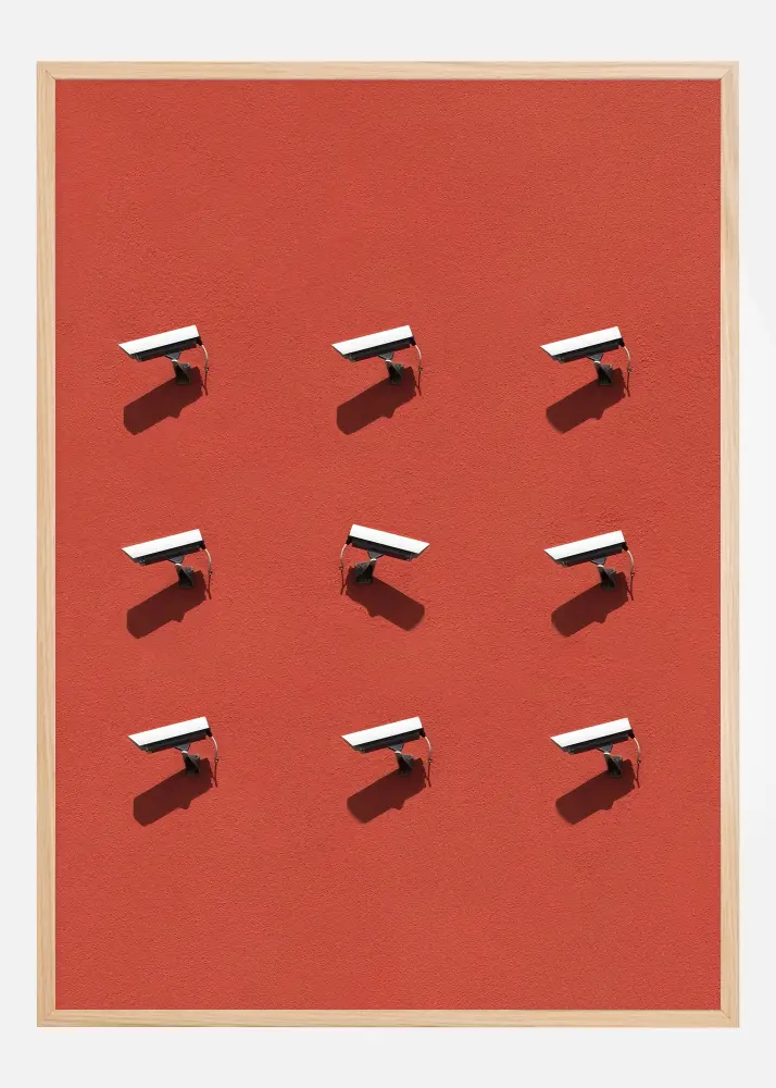 Nuanta roșie adâncă a fundalului oferă un contrast puternic cu camerele alb-negru și creează un sentiment de vigilență și seriozitate. Acest print se potrivește perfect într-un decor modern unde arta întâlnește problemele sociale și este un subiect ideal de discuție pentru birouri, camere de studiu sau camere de zi. Lasă acest poster să devină parte din decorul tău și să inspire discuții și conștientizare despre lumea în care trăim.