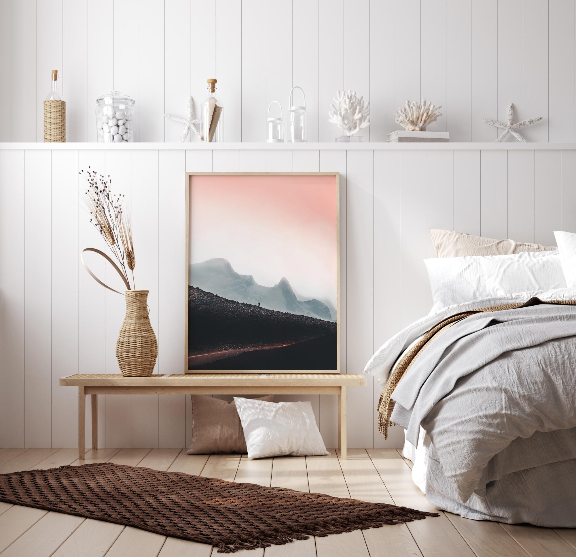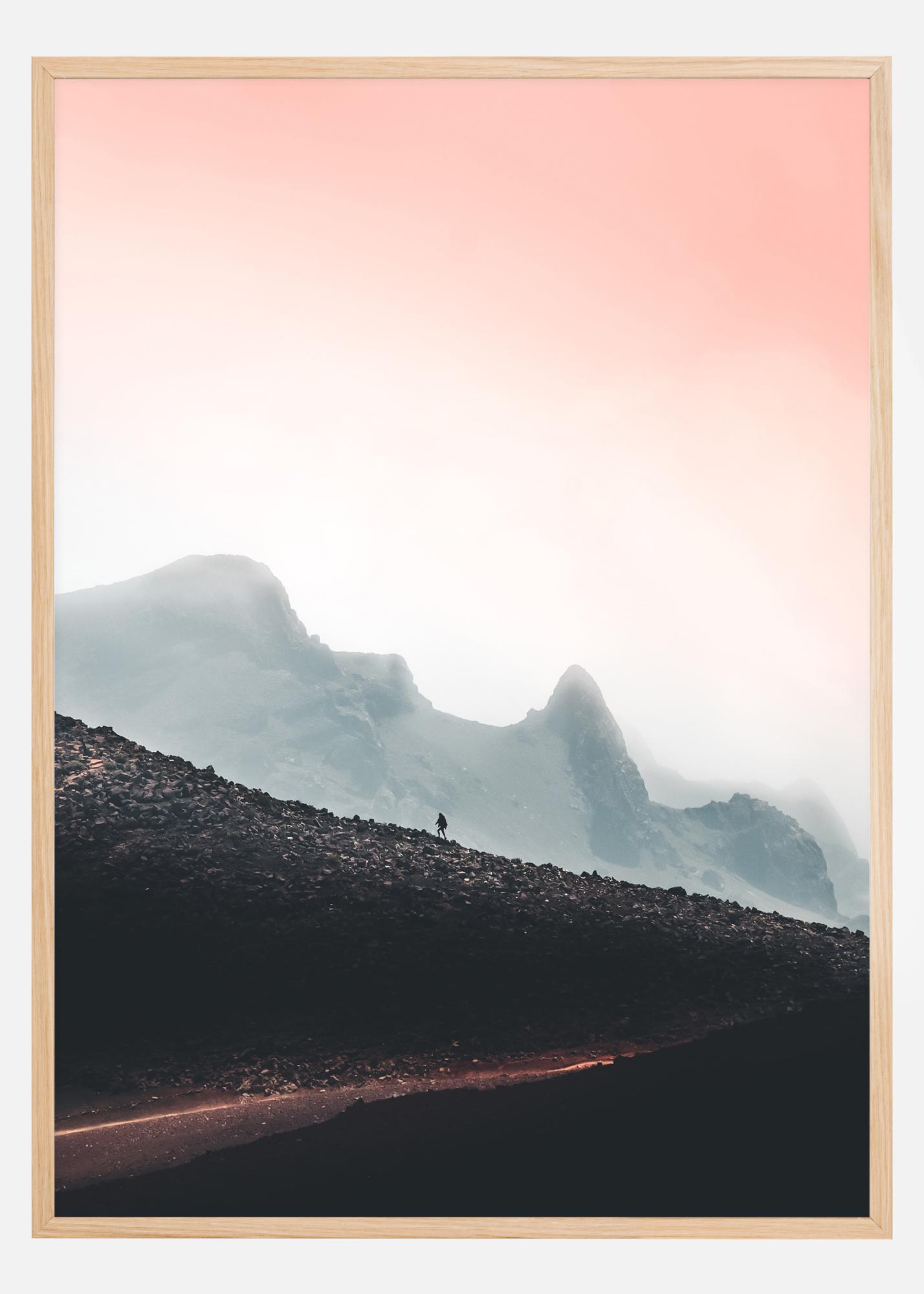 Un imprimeu cețos al unui peisaj. Cu cerul de culoarea piersicii pe fundal, se poate vedea o siluetă îndepărtată care se cațără pe deal. În prim-plan, un mic drum taie dealurile. Un poster perfect pentru cei care iubesc natura.