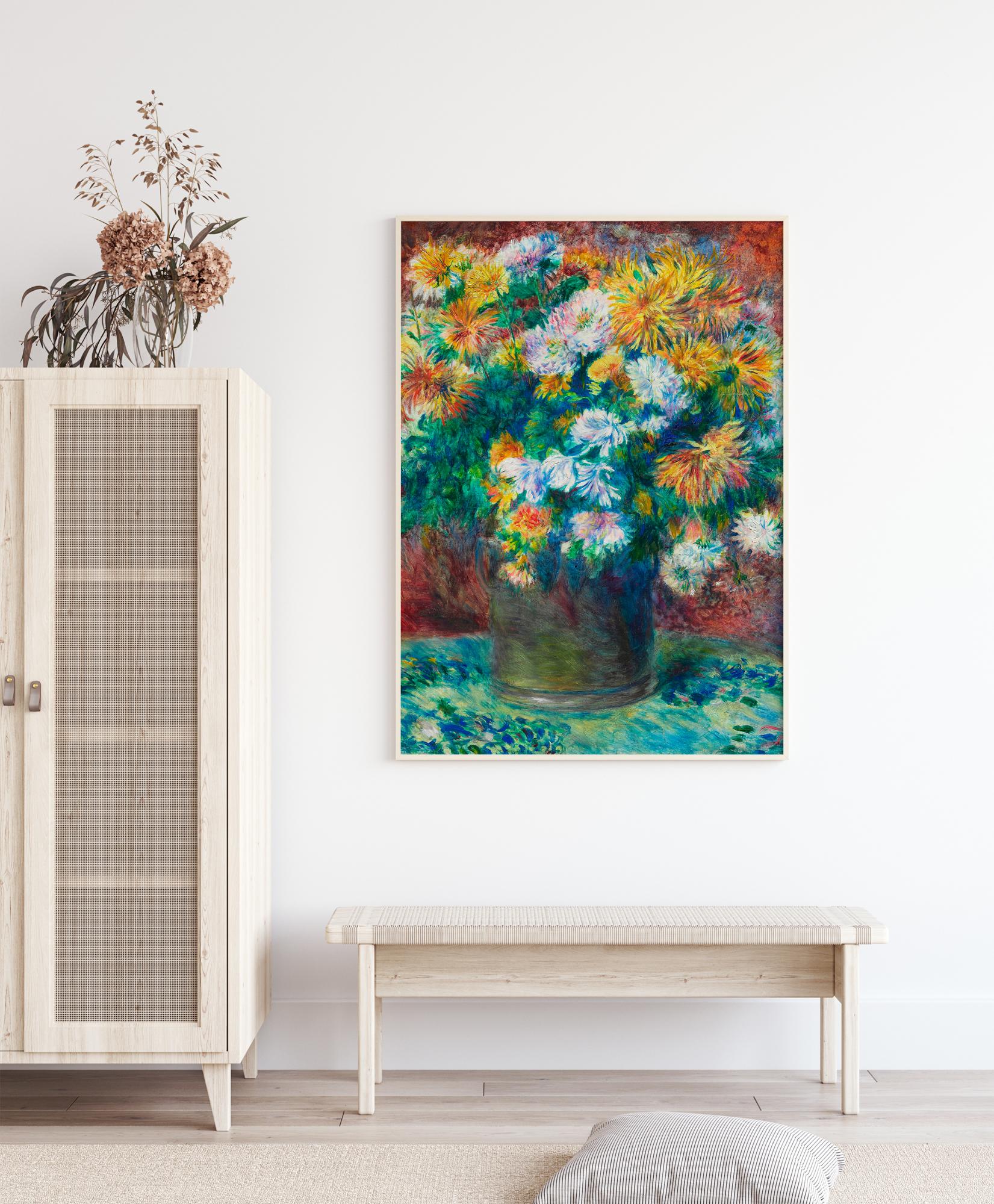Un poster pictat colorat cu un buchet de flori. Pe un fundal multicolor, această paletă frumoasă de culori creează o atmosferă veselă. Florile sunt așezate pe o pânză de culoare turcoaz care evidențiază toate culorile strălucitoare ale acestei imagini. Un imprimeu perfect pentru oricine iubește florile.