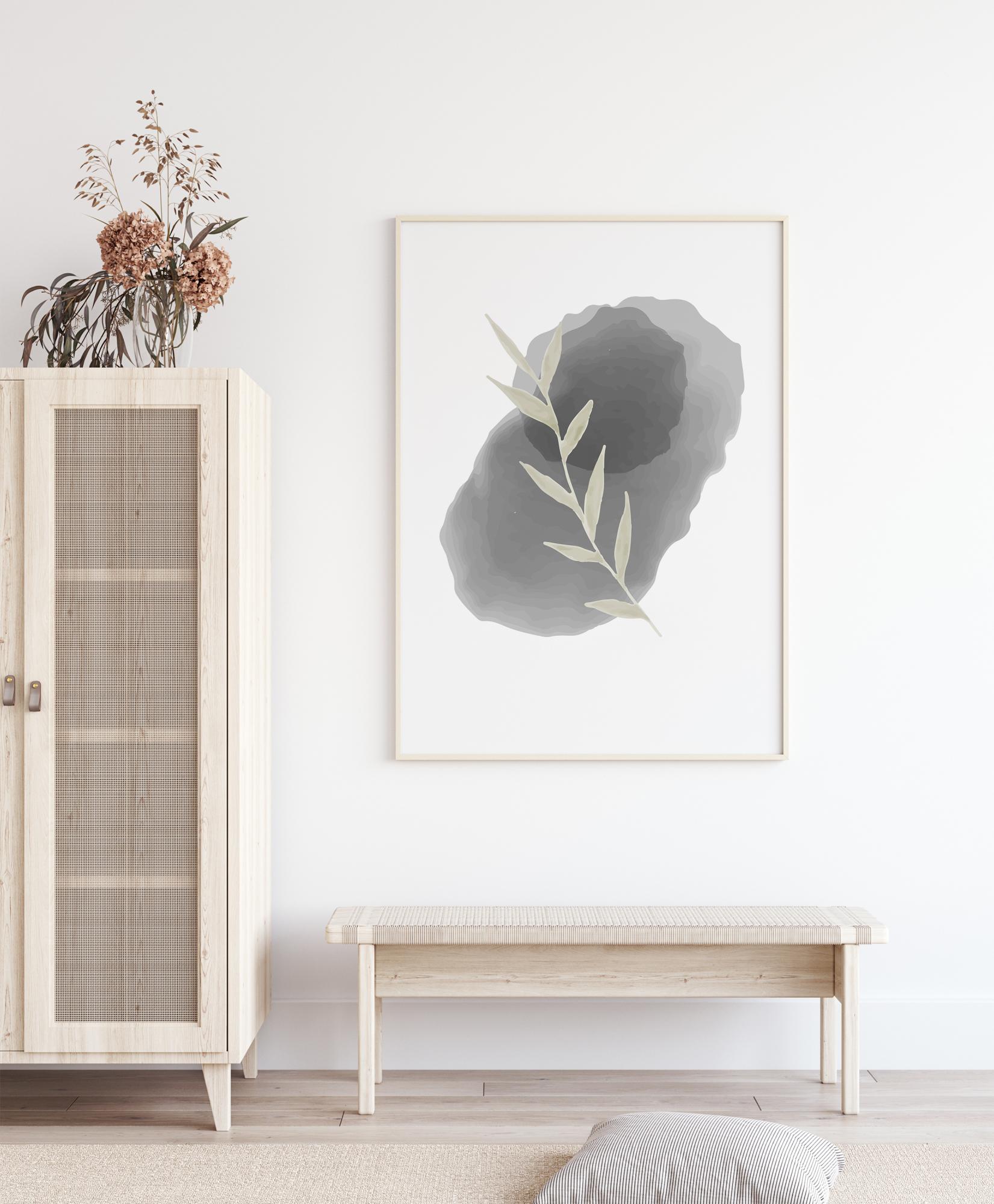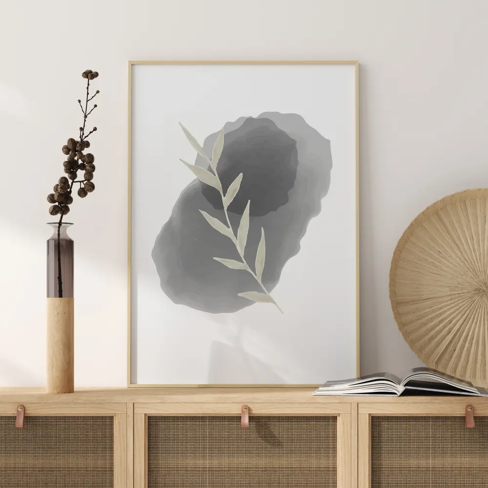 Un imprimat simplu al unei frunze de culoare bej așezată pe o piatră de formă ovală. Pe un fundal alb, frunza se află pe două pietre diferite: o mică piatră neagră, plasată pe o piatră mai mare de culoare bej. Oferă casei tale o notă de delicatețe cu acest poster.
