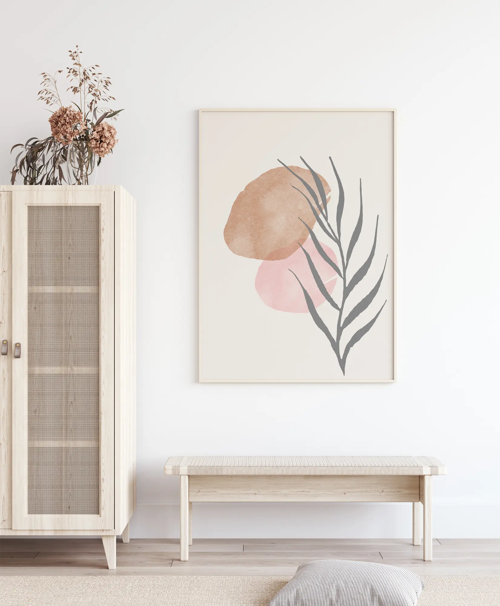 Un poster clar și simplu cu frunze. Pe fundalul alb, frunza gri stă delicat pe marginea a două frunze rotunde și colorate. Tonurile moi ale acestei imprimări creează o atmosferă liniștitoare. Aduceți liniștea în casa dumneavoastră cu această imagine frumoasă, dar simplă.