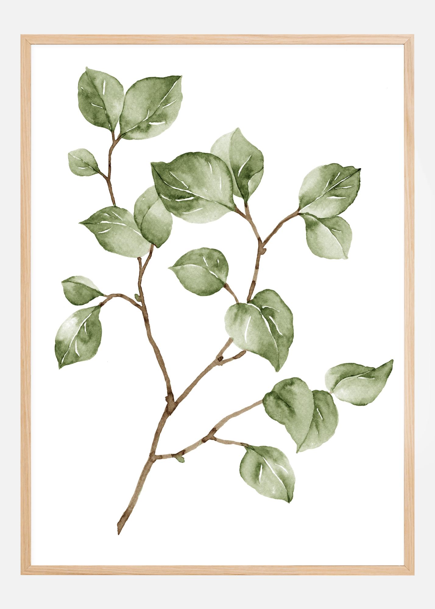 Un poster frumos cu o ramură subțire maro cu frunze mici verzi. Pictat pe o suprafață albă, culorile moi maro și verde evidențiază venele albe delicate de pe frunze. Un imprimeu frumos de agățat pe un perete verde deschis.