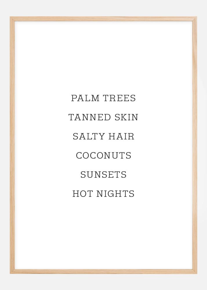 Un poster pasiv care transmite un mesaj cu un sentiment de vară. Cu fontul negru pe o suprafață albă sunt scrise cuvintele: PALMIERI, PIELE BRONZATĂ, PĂR SĂRAT, NUCĂ DE COCOS, APUSURI, NOPȚI CALDE. Cuvintele plasate central ne amintesc de sezonul estival. Adaugă o notă de vară în sufrageria ta modernă cu ajutorul acestei tipărituri.