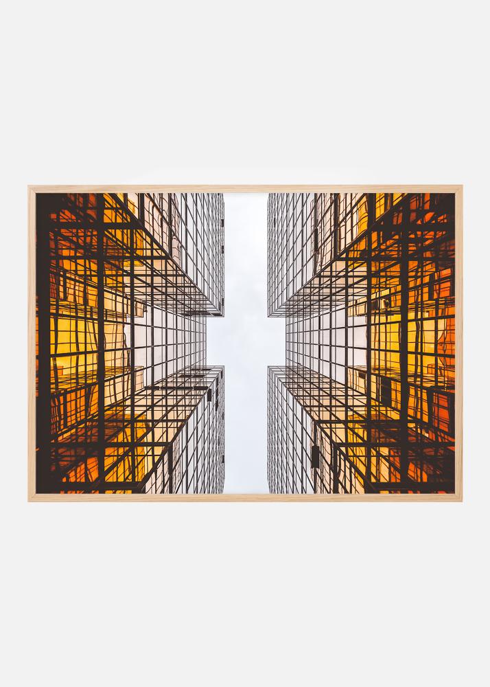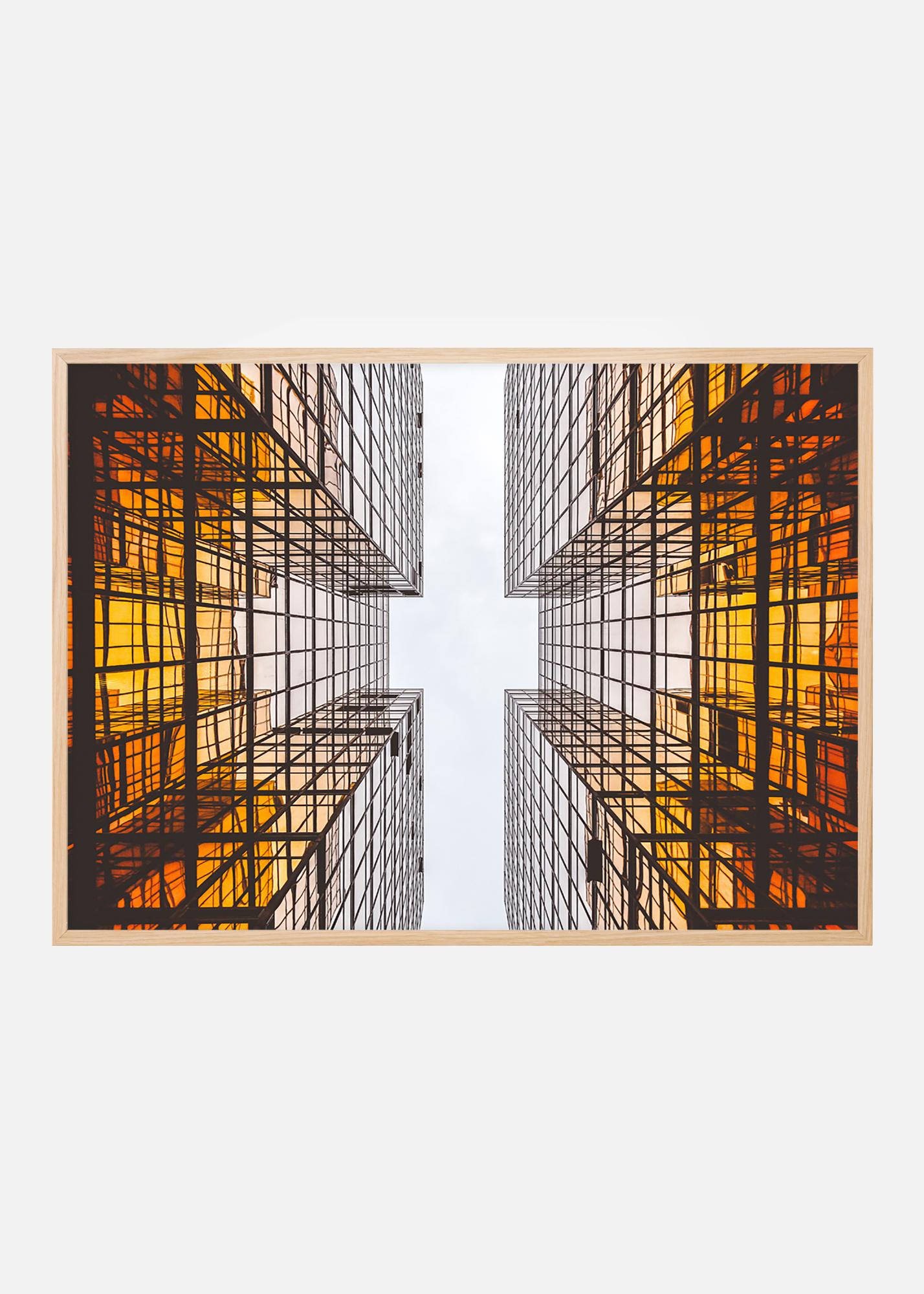Afiș cu arhitectură futuristă care cu liniile sale grafice creează un model interesant. Culorile se estompează de la portocaliu intens la baza clădirii către cerul alb. Posterul se potrivește bine cu o ramă mai subțire atât în decor minimalistic, cât și în alte stiluri cu elemente grafice. Combină-l cu alte tablouri de arhitectură interesantă sau medii urbane.