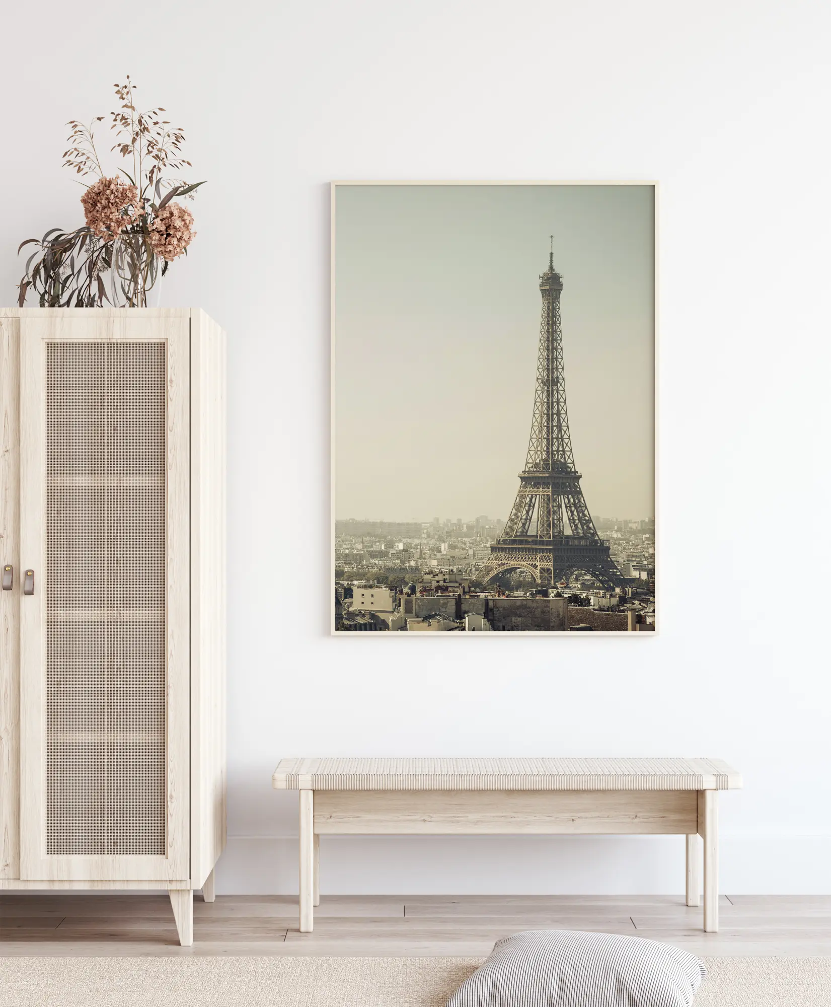 Un poster spectaculos cu Turnul Eiffel. Cerul înnorat amplifică frumusețea acestei structuri arhitectonice spectaculoase. Clădirile înconjurătoare se îmbină perfect în designul alb-negru al acestei imagini. Imaginează-ți priveliștea de la vârful acestei clădiri când vei agăța această imagine în casa ta.