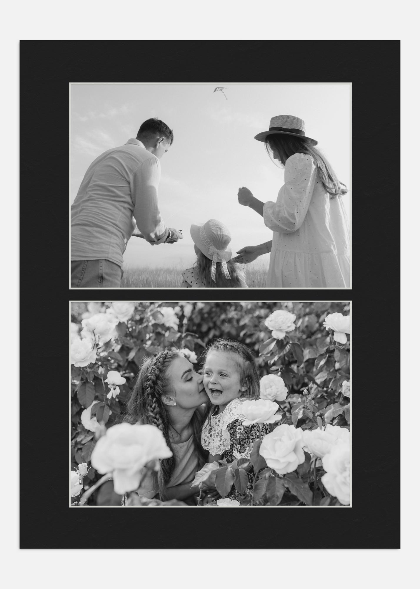 Passepartout pentru colaj negru fără acid, cu margini albe tăiate înclinat de cea mai înaltă calitate. În passepartout există loc pentru 2 imagini. Perfect atunci când vrei să faci un colaj foto propriu.