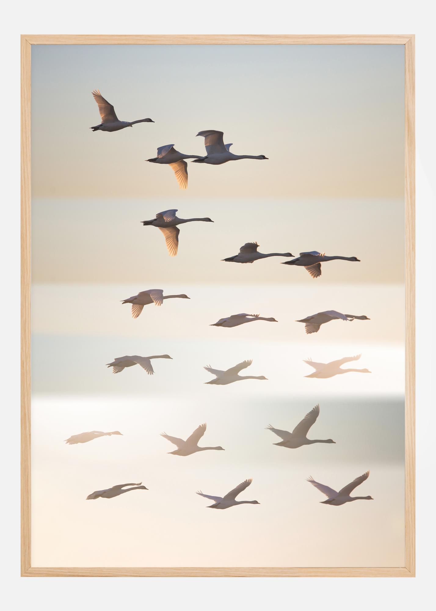 Un poster sălbatic cu un stol de gâște care zboară sus la apus. Această imagine picturală transmite o poveste despre migrație, totul pe un fundal de culori frumoase albastre și portocalii. Alătură-te călătoriei atunci când îl agăți acasă.