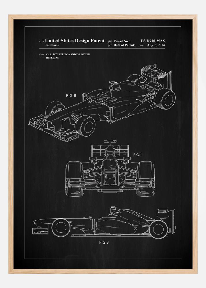 Această poster cu brevet evidențiază designul elegant și complex al unei mașini de Formula 1, conform brevetului de design american US D710,252 S, datat 5 august 2014. Cu liniile sale distinctive și formele sale aerodinamice, designul mașinii este capturat din mai multe perspective, oferind o imagine cuprinzătoare a caracterului său iconic și tehnologic avansat. Acest design este fundamental pentru performanța înaltă și viteza asociate cu cursele de Formula 1.