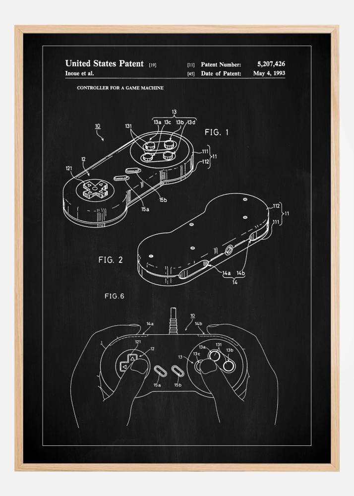 Acest poster de patent evidențiază un design clasic al unui controler de jocuri pentru un Nintendo, numărul de patent 5,207,426, datat 4 mai 1993, pe un fundal elegant de tablă neagră. Desenul patentului arată diferite vederi ale controlerului, inclusiv partea superioară, partea inferioară și perspectiva utilizatorului, descriind detaliat designul butoanelor și al joystick-urilor care au devenit centrale în interacțiunea jucătorilor cu lumile digitale ale jocurilor.
