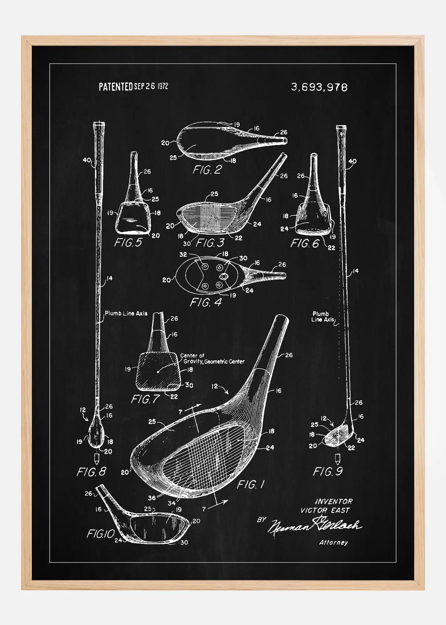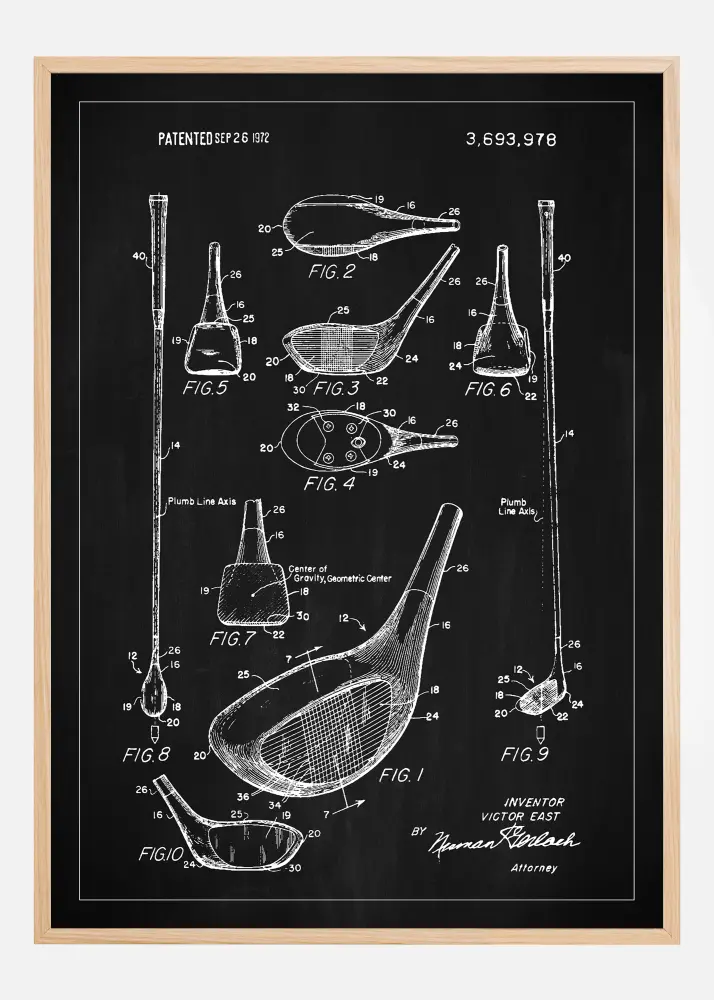 Această poster de brevet este un omagiu adus pasionatului de golf și inventatorului, evidențiind un design avansat al croselor de golf care a fost brevetat pe 26 septembrie 1972 cu numărul de brevet 3,693,978. Diversele figuri, de la FIG. 1 la FIG. 10, ilustrează crosa din mai multe unghiuri și secțiuni, descriind detaliat centrul său geometric și distribuția greutății. Această schiță de brevet nu este doar o interpretare artistică a documentației tehnice, ci și o operă iconică care unește lumile sportului și designului.