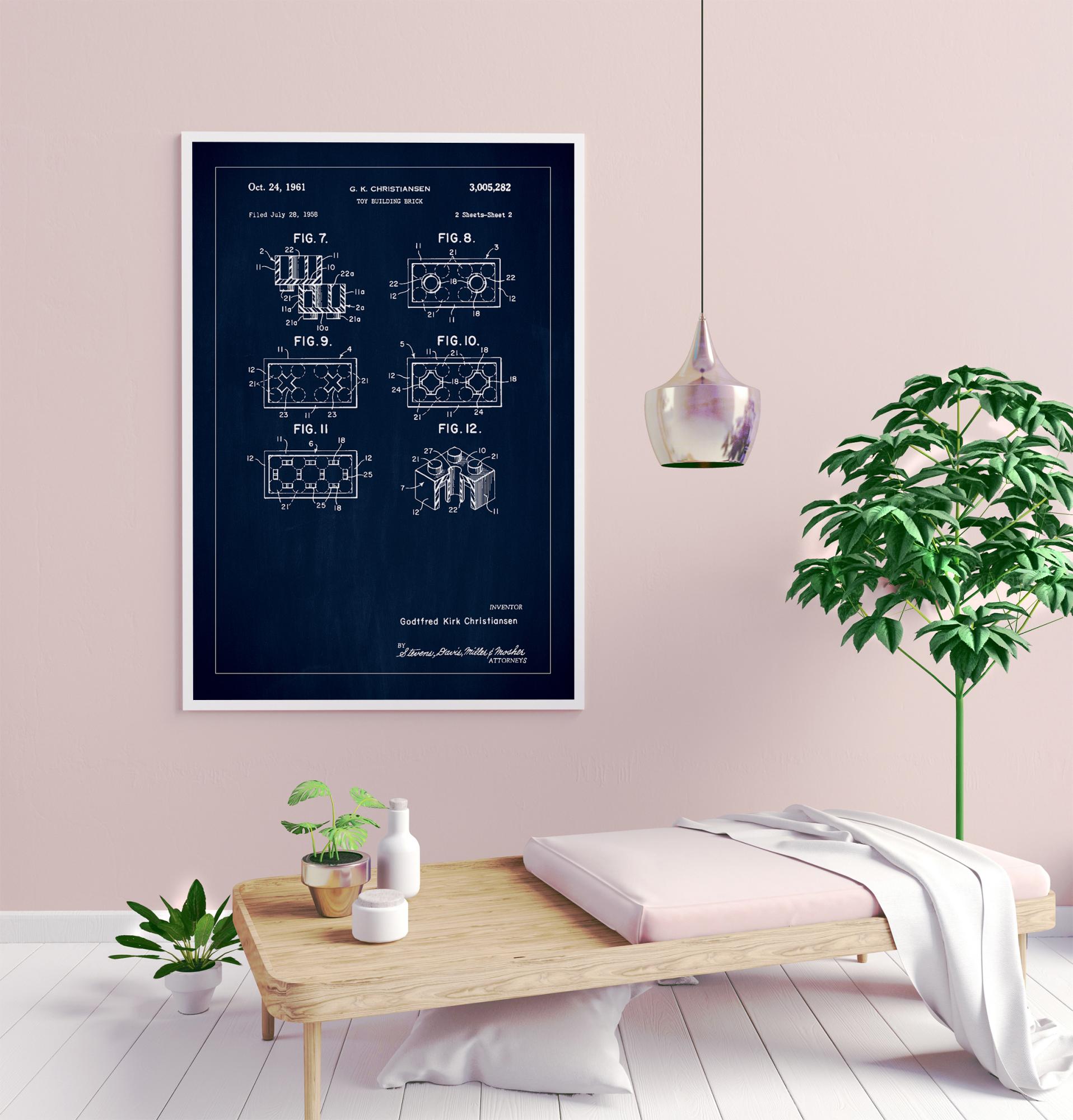 Posterul este ilustrat cu grijă, cu desene detaliate din documentul original al brevetului, inclusiv secțiuni și vederi de plan care descriu mecanismul de conectare unic și revoluționar al designului. Liniile albe pe fundalul albastru închis subliniază natura inteligentă și atemporală a designului, făcând din această schiță de brevet un detaliu decorativ inspirator pentru birouri, camere de joacă sau ca parte a unei prezentări de colecție. Servește nu doar ca o amintire a bucuriei copilăriei, ci și a progreselor creative care continuă să modeleze lumea noastră.