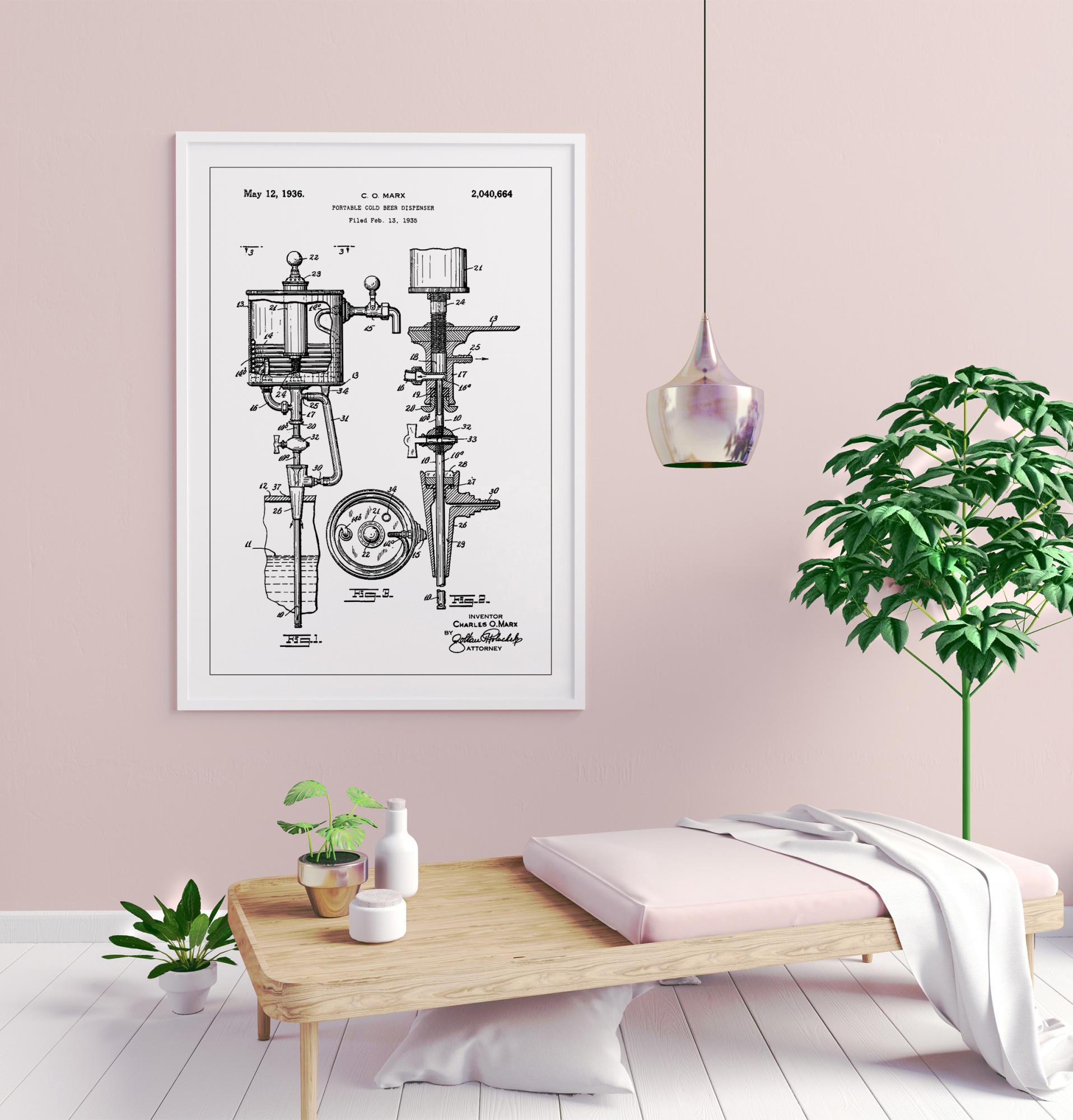 Această poster artistic cu brevet ilustrează designul detaliat al unui dozator portabil de bere rece, care a fost brevetat de Charles O. Marx pe 12 mai 1936. Numărul brevetului 2,040,664 este afișat cu mândrie deasupra aparatului desenat cu atenție, unde fiecare linie și detaliu aduc la viață o creație unică din era industrială. Contrastul elegant alb-negru transformă această ilustrare cu brevet într-un element de decor atemporal care se potrivește perfect oriunde, de la un lounge sofisticat până la o cameră de colecționar entuziast.