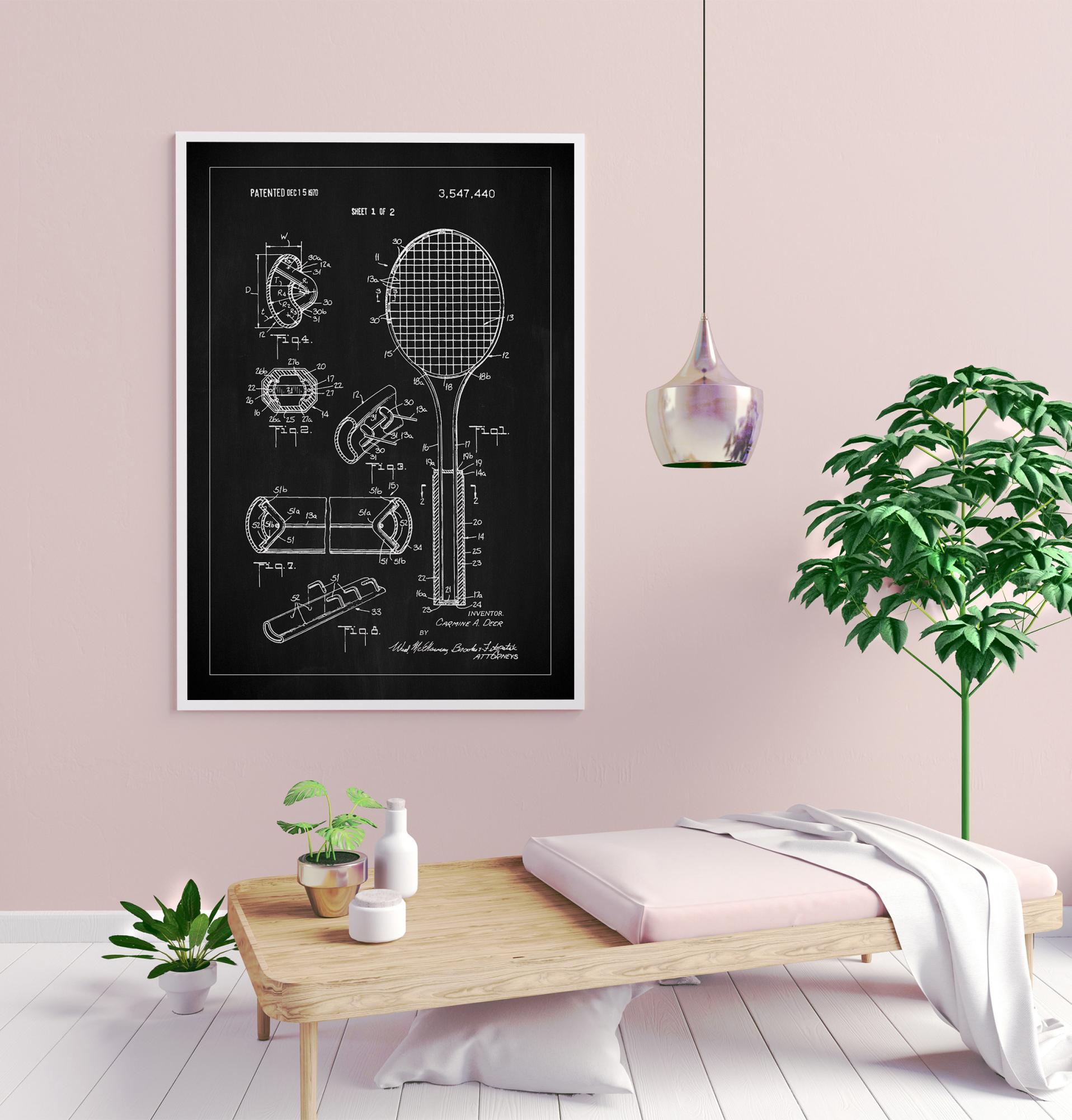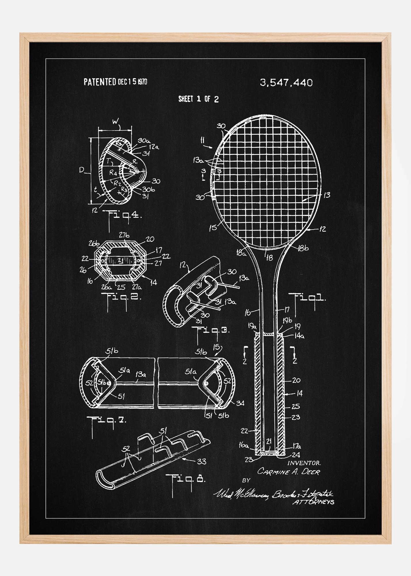 Această poster de brevet prezintă ilustrația tehnică din brevetul american 3,547,440, acordat pe 15 decembrie 1970. Este un activ intelectual și estetic care adaugă un caracter unic oricărei încăperi, ideal pentru pasionații de tenis și iubitorii de design. Aspectul clasic alb-negru al posterului evidențiază structura detaliată a unei rachete de tenis și a componentelor asociate, cum ar fi mânerul și corzile, precum și diverse perspective și secțiuni ale construcției care sunt prezentate în diferitele figuri.