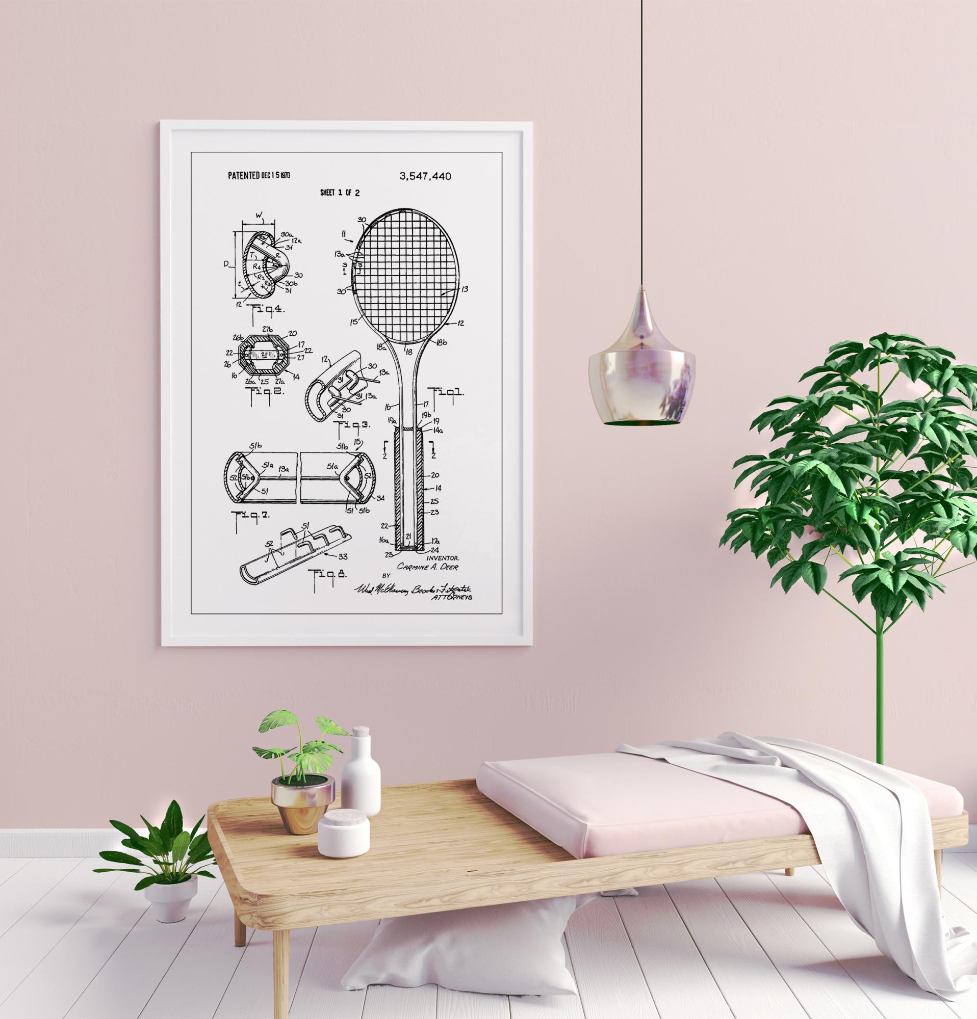 Această poster de brevet redă un desen tehnic din istoricul Brevet U.S. 3,547,440, acordat pe 15 decembrie 1970, care prezintă invenția unei rachete de tenis. Cu liniile sale precise și schițele detaliate ale diferitelor părți ale rachetei, de la mâner la modelul de încordare, acest poster este o adevărată reprezentare a artei inginerești și a rafinamentului de design.