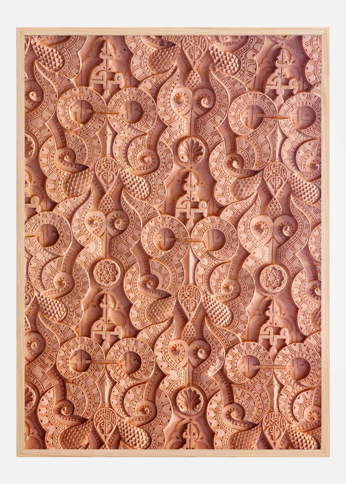 Culorile motivului se mențin într-o paletă de teracotă caldă și lut, oferind o senzație naturală și rustică imaginii. Modelul detaliat iese bine în evidență pe fundalul uniform și creează o iluzie tridimensională care este atât atrăgătoare, cât și profundă. Acest poster este perfect pentru cei care apreciază arta care atrage privirea și invită la studiu mai atent, și care prețuiesc meșteșugul și tradiția în stilul lor de decorare interioară.