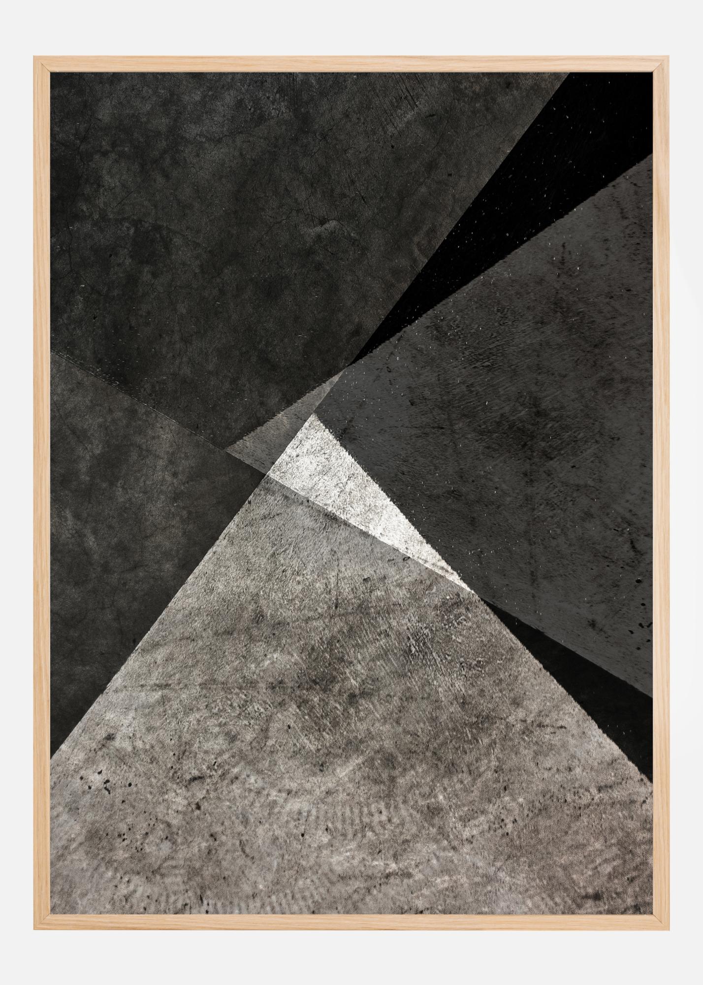 Un imprimeu misterios cu forme triunghiulare negre și albe plasate pe un podea. Cu lumina naturală care strălucește pe plăci, nu este clar dacă triunghiul mai mic este alb sau doar este iluminat de lumină. Acesta este un poster perfect de agățat pe un perete neted.