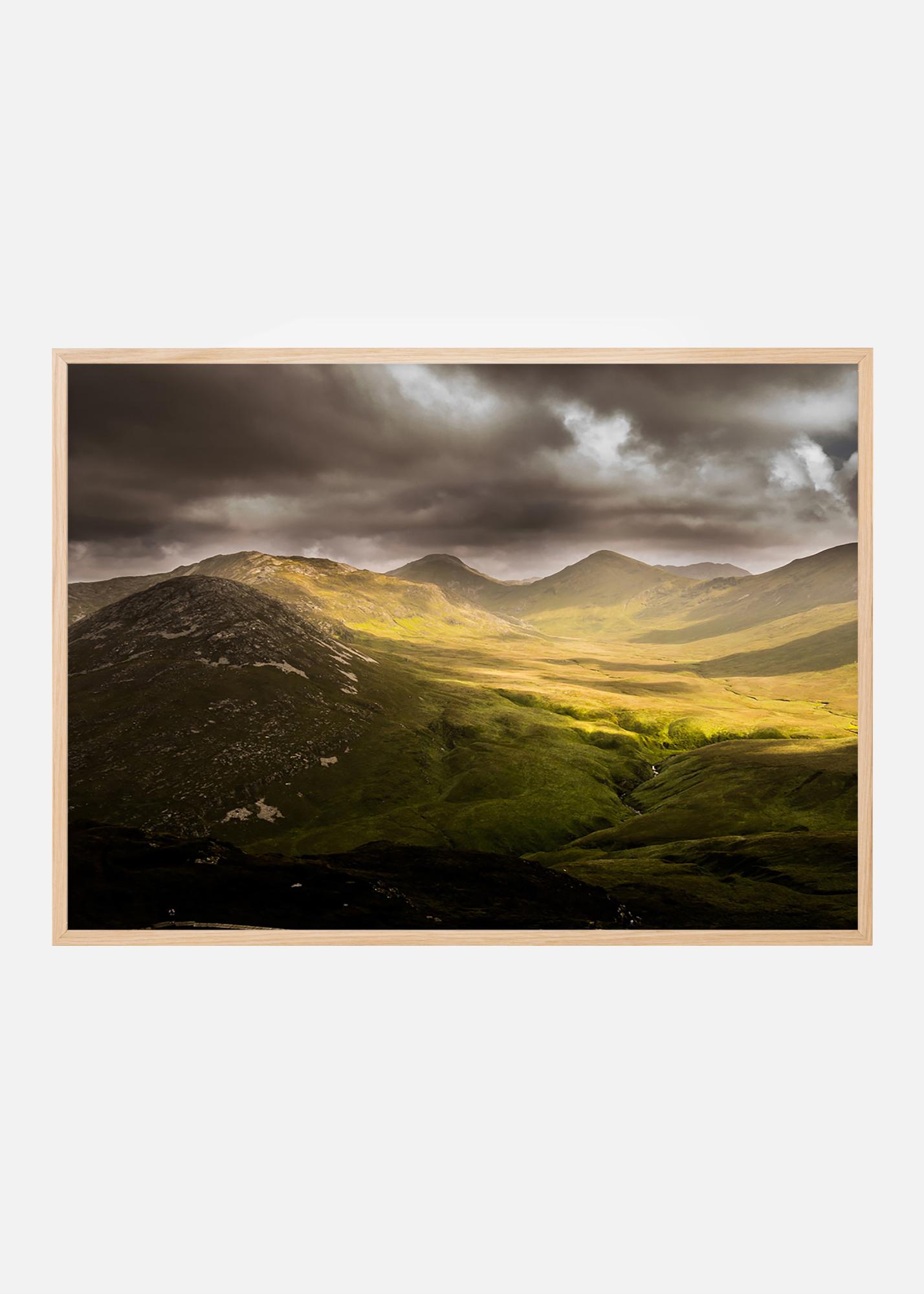 Peisaj dramatic cu nori de furtună care se ridică deasupra unui lanț muntos, în timp ce soarele luminează valea de dedesubt. Culorile estompate subliniază dramatismul imaginii și fac ca fotografia să se evidențieze cu adevărat. Se potrivește cel mai bine într-o ramă care evidențiază adâncimea imaginii și nu atrage atenția de la subiect.