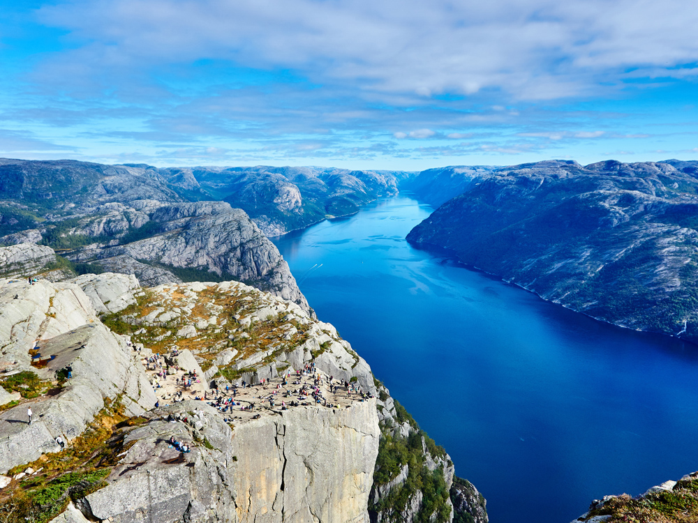 Fotografie cu o vedere uimitoare pe distanțe lungi asupra unei văi adânci fiordice. Posterul este în tonuri albastre de mare, cu stânci goale luminate de soare de ambele părți ale fiordului, un peisaj grandios care se potrivește pe peretele celui care apreciază un peisaj natural frumos. Completează imaginea cu o ramă de tablou care evidențiază motivul.