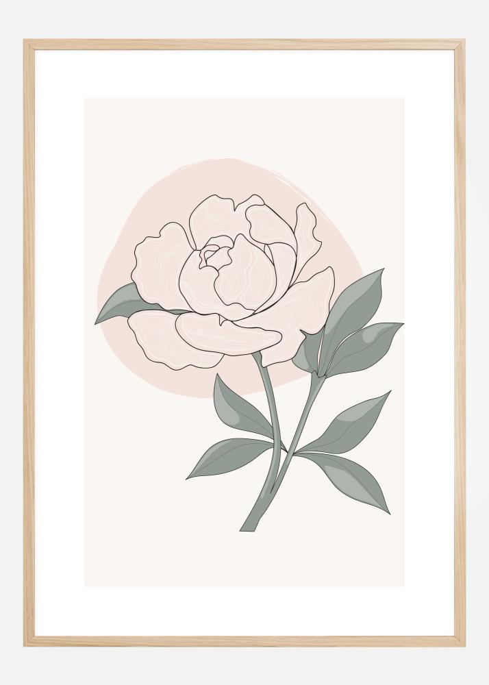 Un poster artistic cu o tulpină de bujor și o floare roz. Pe un fundal bej, floarea roz este așezată pe o figură de culoare piersică, în timp ce frunzele au fost schițate în negru. Aduceți în casa dvs. fragilitatea acestei flori.